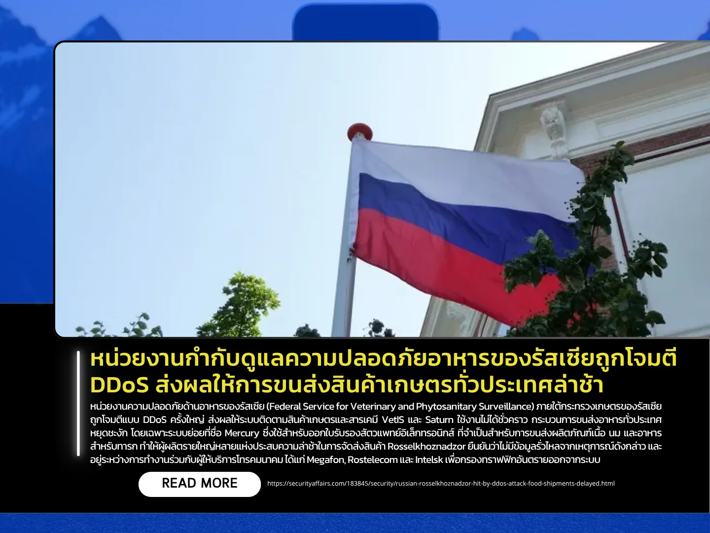 หน่วยงานความปลอดภัยด้านอาหารของรัสเซีย (Federal Service for Veterinary and Phytosanitary Surveillance) ภายใต้กระทรวงเกษตรของรัสเซีย ถูกโจมตีแบบ DDoS ครั้งใหญ่ ส่งผลให้ระบบติดตามสินค้าเกษตรและสารเคมี VetIS และ Saturn ใช้งานไม่ได้ชั่วคราว กระบวนการขนส่งอาหารทั่วประเทศหยุดชะงัก โดยเฉพาะระบบย่อยที่ชื่อ Mercury ซึ่งใช้สำหรับออกใบรับรองสัตวแพทย์อิเล็กทรอนิกส์ ที่จำเป็นสำหรับการขนส่งผลิตภัณฑ์เนื้อ นม และอาหารสำหรับทารก ทำให้ผู้ผลิตรายใหญ่หลายแห่งประสบความล่าช้าในการจัดส่งสินค้า