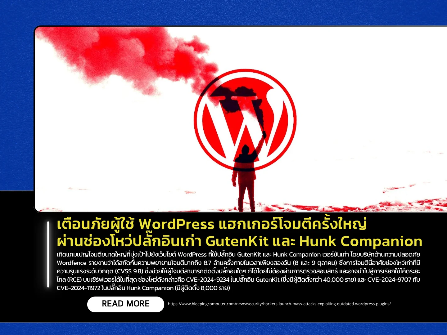 เกิดแคมเปญโจมตีขนาดใหญ่ที่มุ่งเป้าไปยังเว็บไซต์ WordPress ที่ใช้ปลั๊กอิน GutenKit และ Hunk Companion เวอร์ชันเก่า โดยบริษัทด้านความปลอดภัย Wordfence รายงานว่าได้สกัดกั้นความพยายามโจมตีมากถึง 8.7 ล้านครั้งภายในเวลาเพียงสองวัน (8 และ 9 ตุลาคม) ซึ่งการโจมตีนี้อาศัยช่องโหว่เก่าที่มีความรุนแรงระดับวิกฤต ( CVSS 9.8 ) ซึ่งช่วยให้ผู้โจมตีสามารถติดตั้งปลั๊กอินใดๆ ก็ได้โดยไม่ต้องผ่านการตรวจสอบสิทธิ์ และอาจนำไปสู่การเรียกใช้โค้ดระยะไกล (RCE) บนเซิร์ฟเวอร์ได้ในที่สุด ช่องโหว่ดังกล่าวคือ CVE-2024-9234 ในปลั๊กอิน GutenKit (ซึ่งมีผู้ติดตั้งกว่า 40,000 ราย) และ CVE-2024-9707 กับ CVE-2024-11972 ในปลั๊กอิน Hunk Companion (มีผู้ติดตั้ง 8,000 ราย)