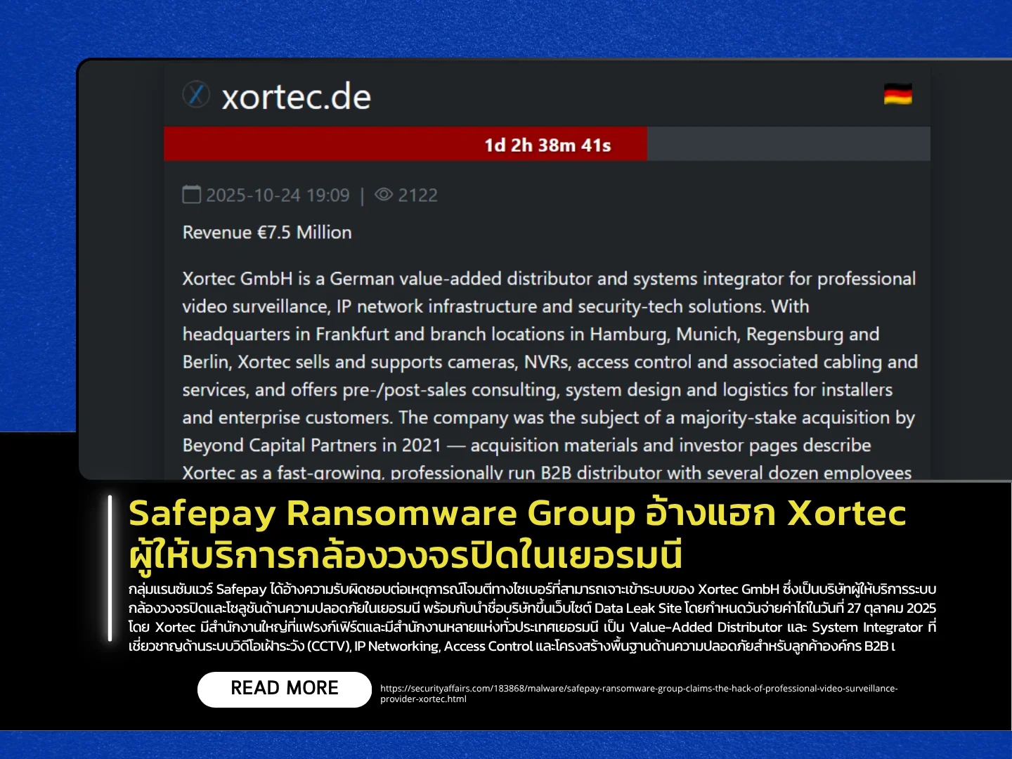 กลุ่มแรนซัมแวร์ Safepay ได้อ้างความรับผิดชอบต่อเหตุการณ์โจมตีทางไซเบอร์ที่สามารถเจาะเข้าระบบของ Xortec GmbH ซึ่งเป็นบริษัทผู้ให้บริการระบบกล้องวงจรปิดและโซลูชันด้านความปลอดภัยในเยอรมนี พร้อมกับนำชื่อบริษัทขึ้นเว็บไซต์ Data Leak Site โดยกำหนดวันจ่ายค่าไถ่ในวันที่ 27 ตุลาคม 2025 โดย Xortec มีสำนักงานใหญ่ที่แฟรงก์เฟิร์ตและมีสำนักงานหลายแห่งทั่วประเทศเยอรมนี เป็น Value-Added Distributor และ System Integrator ที่เชี่ยวชาญด้านระบบวิดีโอเฝ้าระวัง (CCTV), IP Networking, Access Control และโครงสร้างพื้นฐานด้านความปลอดภัยสำหรับลูกค้าองค์กร B2B เช่น อินทิเกรเตอร์ ผู้ติดตั้งระบบเฉพาะทาง และรีเซลเลอร์ โดยเฉพาะในภูมิภาค DACH (เยอรมนี ออสเตรีย สวิตเซอร์แลนด์) รวมถึงตลาดสากล บริษัทถูกซื้อกิจการโดย Beyond Capital Partners ในปี 2021 และมีรายได้ต่อปีมากกว่า 7.5 ล้านยูโร