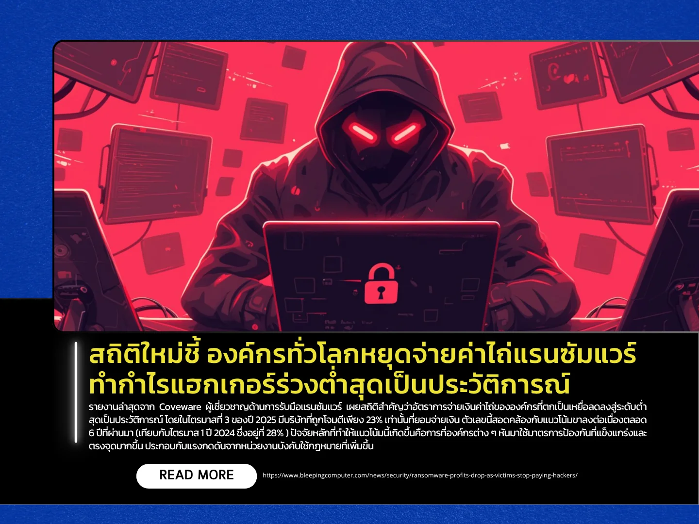 รายงานล่าสุดจาก Coveware ผู้เชี่ยวชาญด้านการรับมือแรนซัมแวร์ เผยสถิติสำคัญว่าอัตราการจ่ายเงินค่าไถ่ขององค์กรที่ตกเป็นเหยื่อลดลงสู่ระดับต่ำสุดเป็นประวัติการณ์ โดยในไตรมาสที่ 3 ของปี 2025 มีบริษัทที่ถูกโจมตีเพียง 23% เท่านั้นที่ยอมจ่ายเงิน ตัวเลขนี้สอดคล้องกับแนวโน้มขาลงต่อเนื่องตลอด 6 ปีที่ผ่านมา (เทียบกับไตรมาส 1 ปี 2024 ซึ่งอยู่ที่ 28% ) ปัจจัยหลักที่ทำให้แนวโน้มนี้เกิดขึ้นคือการที่องค์กรต่าง ๆ หันมาใช้มาตรการป้องกันที่แข็งแกร่งและตรงจุดมากขึ้น ประกอบกับแรงกดดันจากหน่วยงานบังคับใช้กฎหมายที่เพิ่มขึ้น ซึ่งแนะนำให้เหยื่อไม่ควรจ่ายเงินค่าไถ่ โดยผู้เชี่ยวชาญมองว่านี่คือสัญญาณบวกที่แสดงถึงความก้าวหน้าในการรับมือร่วมกันของทุกฝ่าย และการที่ไม่จ่ายเงินในแต่ละครั้งก็เปรียบเสมือนการตัดท่อออกซิเจนของเหล่าอาชญากรไซเบอร์