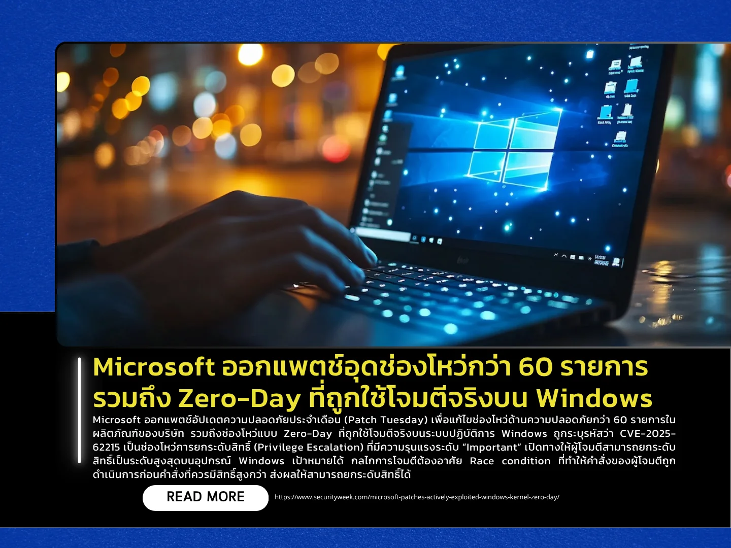 Microsoft ออกแพตช์อัปเดตความปลอดภัยประจำเดือน (Patch Tuesday) เพื่อแก้ไขช่องโหว่ด้านความปลอดภัยกว่า 60 รายการในผลิตภัณฑ์ของบริษัท รวมถึงช่องโหว่แบบ Zero-Day ที่ถูกใช้โจมตีจริงบนระบบปฏิบัติการ Windows ถูกระบุรหัสว่า CVE-2025-62215 เป็นช่องโหว่การยกระดับสิทธิ์ (Privilege Escalation) ที่มีความรุนแรงระดับ “Important” เปิดทางให้ผู้โจมตีสามารถยกระดับสิทธิ์เป็นระดับสูงสุดบนอุปกรณ์ Windows เป้าหมายได้ กลไกการโจมตีต้องอาศัย Race condition ที่ทำให้คำสั่งของผู้โจมตีถูกดำเนินการก่อนคำสั่งที่ควรมีสิทธิ์สูงกว่า ส่งผลให้สามารถยกระดับสิทธิ์ได้