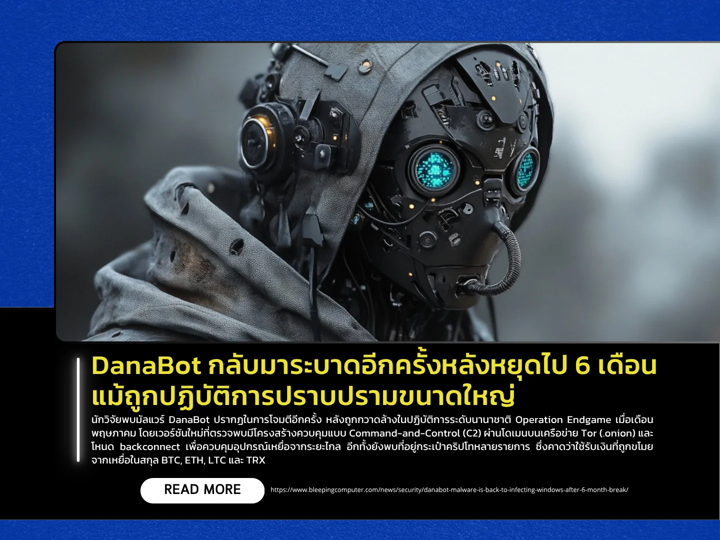 การกลับมาของ DanaBot สะท้อนถึงความยืดหยุ่นของกลุ่มผู้โจมตี แม้โครงสร้างพื้นฐานเดิมจะถูกปิดไป แต่สามารถปรับตัวสร้างระบบใหม่ขึ้นและกลับมาดำเนินการได้อย่างรวดเร็ว โดยยังใช้วิธีแพร่กระจายรูปแบบเดิม เช่น อีเมลแนบไฟล์อันตราย ลิงก์ฟิชชิง การโจมตีแบบ SEO poisoning และโฆษณาที่แฝงมัลแวร์ ซึ่งบางกรณีเชื่อมโยงกับแรนซัมแวร์ ผู้เชี่ยวชาญแนะนำให้จัดการบล็อกตัวชี้วัดภัยคุกคาม (IoCs) ล่าสุด และเร่งอัปเดตระบบรักษาความปลอดภัยอย่างสม่ำเสมอเพื่อป้องกันความเสี่ยงในการถูกโจมตี