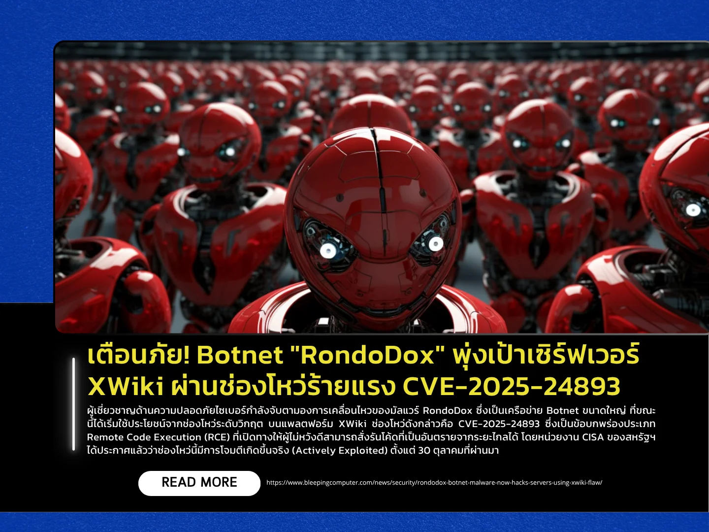 ผู้เชี่ยวชาญด้านความปลอดภัยไซเบอร์กำลังจับตามองการเคลื่อนไหวของมัลแวร์ RondoDox ซึ่งเป็นเครือข่าย Botnet ขนาดใหญ่ ที่ขณะนี้ได้เริ่มใช้ประโยชน์จากช่องโหว่ระดับวิกฤต บนแพลตฟอร์ม XWiki ช่องโหว่ดังกล่าวคือ CVE-2025-24893 ซึ่งเป็นข้อบกพร่องประเภท Remote Code Execution (RCE) ที่เปิดทางให้ผู้ไม่หวังดีสามารถสั่งรันโค้ดที่เป็นอันตรายจากระยะไกลได้ โดยหน่วยงาน CISA ของสหรัฐฯ ได้ประกาศแล้วว่าช่องโหว่นี้มีการโจมตีเกิดขึ้นจริง (Actively Exploited) ตั้งแต่ 30 ตุลาคมที่ผ่านมา และรายงานล่าสุดจาก VulnCheck ยังชี้ชัดว่ามีผู้โจมตีหลายกลุ่มกำลังใช้ช่องโหว่นี้ ไม่ใช่เพียง RondoDox แต่ยังรวมถึงกลุ่มที่มุ่งหวังติดตั้งมัลแวร์ขุดเหมืองคริปโตเคอร์เรนซีด้วย