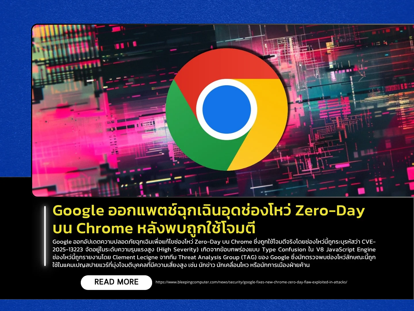 Google ออกอัปเดตความปลอดภัยฉุกเฉินเพื่อแก้ไขช่องโหว่ Zero-Day บน Chrome ซึ่งถูกใช้โจมตีจริงโดยช่องโหว่นี้ถูกระบุรหัสว่า CVE-2025-13223 จัดอยู่ในระดับความรุนแรงสูง (High Severity) เกิดจากข้อบกพร่องแบบ Type Confusion ใน V8 JavaScript Engine ช่องโหว่นี้ถูกรายงานโดย Clement Lecigne จากทีม Threat Analysis Group (TAG) ของ Google ซึ่งมักตรวจพบช่องโหว่ลักษณะนี้ถูกใช้ในแคมเปญสปายแวร์ที่มุ่งโจมตีบุคคลที่มีความเสี่ยงสูง เช่น นักข่าว นักเคลื่อนไหว หรือนักการเมืองฝ่ายค้าน