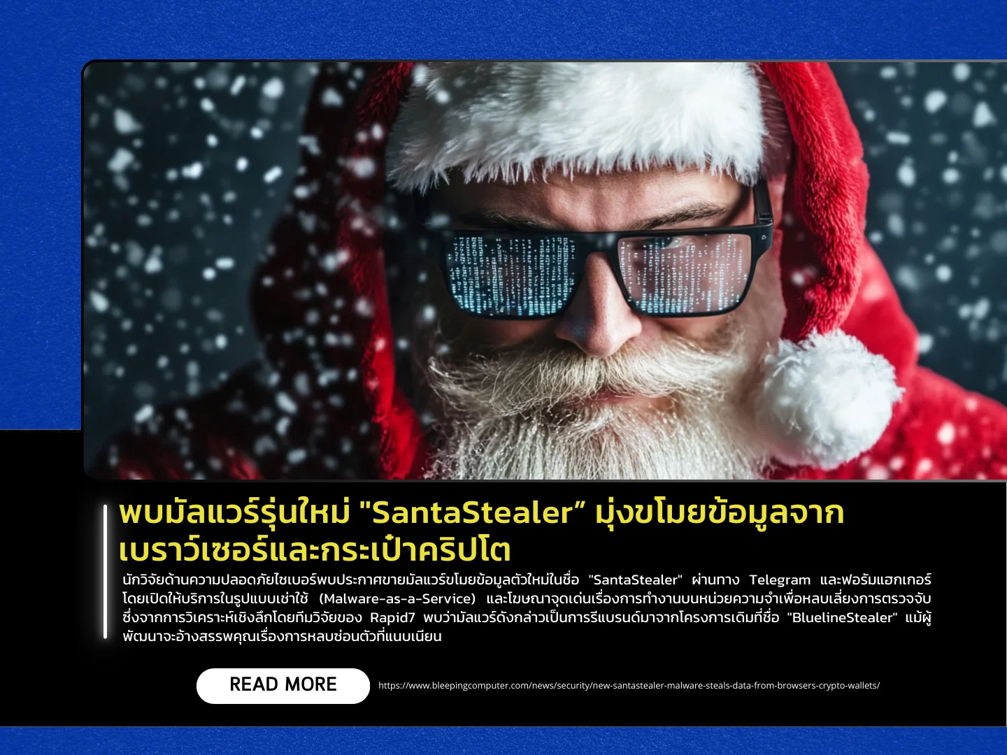 นักวิจัยด้านความปลอดภัยไซเบอร์พบประกาศขายมัลแวร์ขโมยข้อมูลตัวใหม่ในชื่อ “SantaStealer” ผ่านทาง Telegram และฟอรัมแฮกเกอร์ โดยเปิดให้บริการในรูปแบบเช่าใช้ (Malware-as-a-Service) และโฆษณาจุดเด่นเรื่องการทำงานบนหน่วยความจำเพื่อหลบเลี่ยงการตรวจจับ ซึ่งจากการวิเคราะห์เชิงลึกโดยทีมวิจัยของ Rapid7 พบว่ามัลแวร์ดังกล่าวเป็นการรีแบรนด์มาจากโครงการเดิมที่ชื่อ “BluelineStealer” แม้ผู้พัฒนาจะอ้างสรรพคุณเรื่องการหลบซ่อนตัวที่แนบเนียน แต่จากการตรวจสอบตัวอย่างโค้ดที่หลุดออกมาพบว่ายังมีข้อบกพร่องด้านความปลอดภัยในการปฏิบัติงาน (OpSec) ของผู้สร้างเอง ทำให้ผู้เชี่ยวชาญสามารถวิเคราะห์โครงสร้างและตรวจจับได้ง่ายกว่าที่โฆษณาไว้