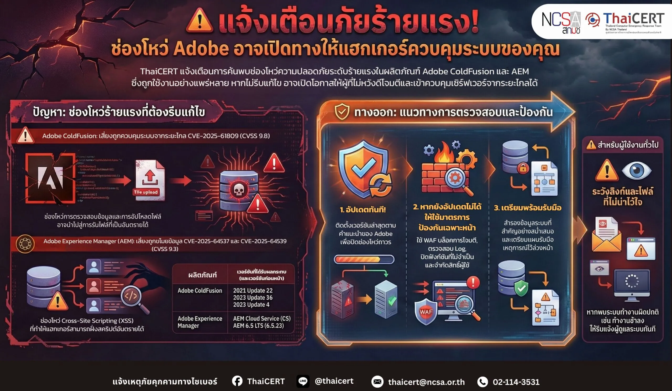 ThaiCERT ได้ติดตามสถานการณ์ภัยคุกคามทางไซเบอร์อย่างใกล้ชิด และพบว่า Adobe ได้ออกอัปเดตความปลอดภัยเพื่อแก้ไขช่องโหว่ร้ายแรงหลายรายการ ซึ่งส่งผลกระทบต่อผลิตภัณฑ์ที่มีการใช้งานอย่างแพร่หลายในหน่วยงานภาครัฐ ภาคเอกชน และองค์กรขนาดใหญ่ หากยังคงใช้งานเวอร์ชันที่ได้รับผลกระทบโดยไม่ทำการแก้ไข อาจเปิดโอกาสให้ผู้ไม่หวังดีใช้เป็นช่องทางโจมตีระบบ และควบคุมเซิร์ฟเวอร์จากระยะไกลได้