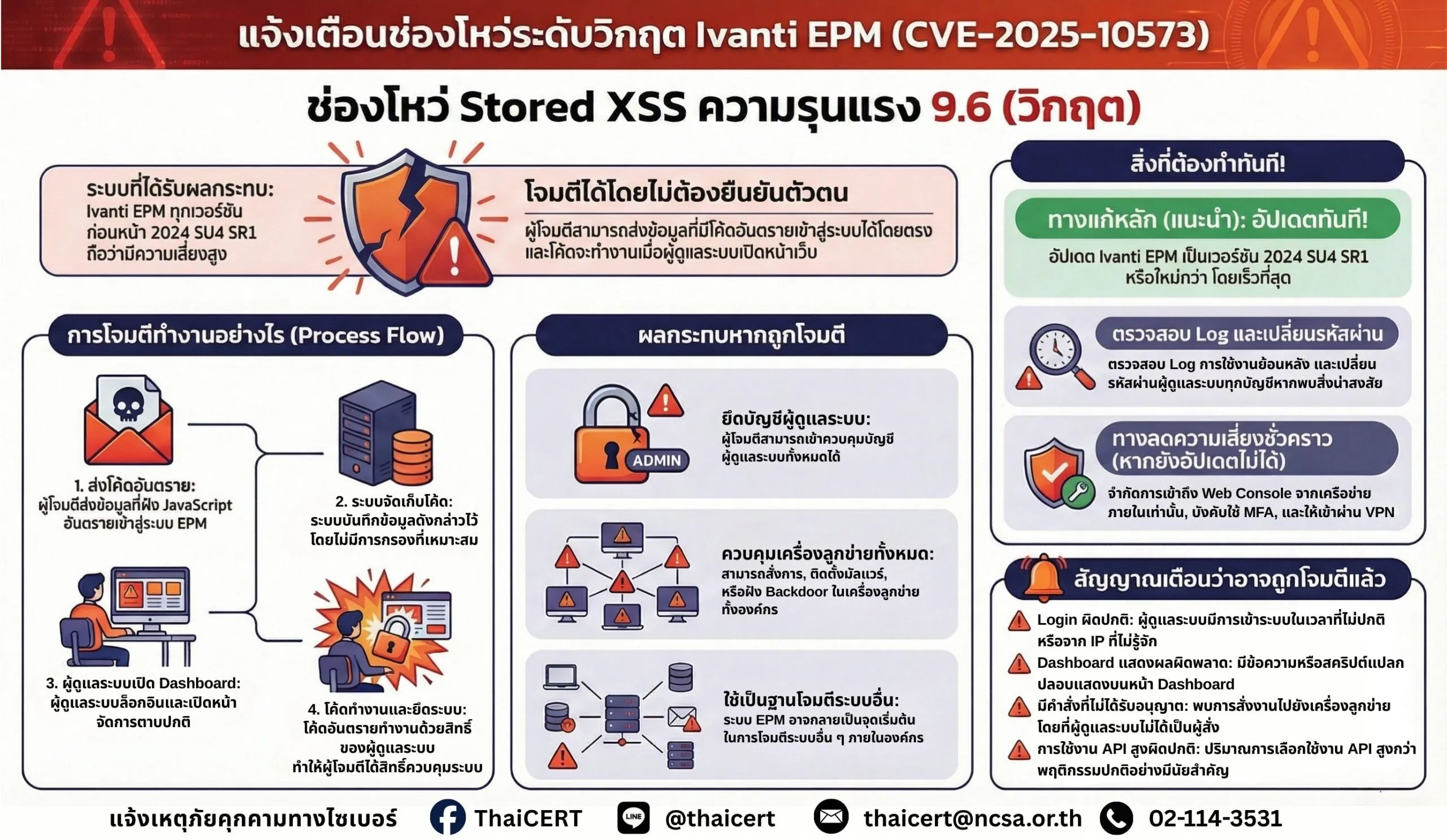 ThaiCERT ตรวจพบรายงานช่องโหว่ความรุนแรงระดับวิกฤต หมายเลข CVE-2025-10573 ในผลิตภัณฑ์ Ivanti Endpoint Manager (EPM) ซึ่งเป็นช่องโหว่ประเภท Stored Cross-Site Scripting (Stored XSS) โดยมีคะแนนความรุนแรงตามมาตรฐาน CVSS v3.1 เท่ากับ 9.6
