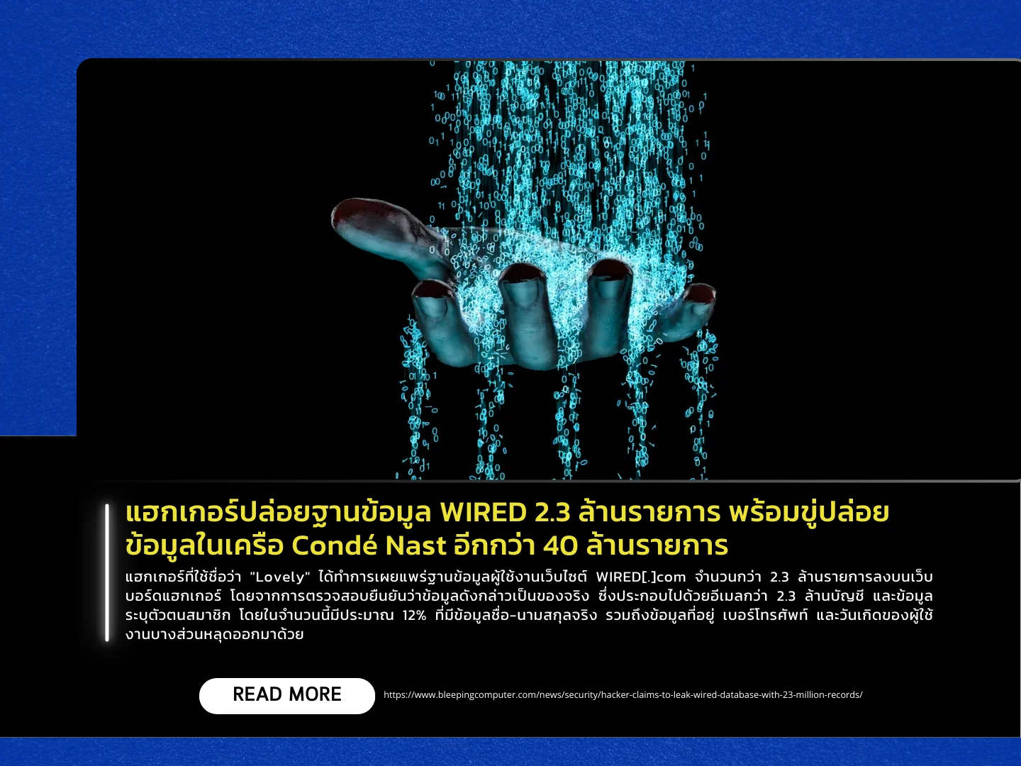แฮกเกอร์ที่ใช้ชื่อว่า “Lovely” ได้ทำการเผยแพร่ฐานข้อมูลผู้ใช้งานเว็บไซต์ WIRED[.]com จำนวนกว่า 2.3 ล้านรายการลงบนเว็บบอร์ดแฮกเกอร์ โดยจากการตรวจสอบยืนยันว่าข้อมูลดังกล่าวเป็นของจริง ซึ่งประกอบไปด้วยอีเมลกว่า 2.3 ล้านบัญชี และข้อมูลระบุตัวตนสมาชิก โดยในจำนวนนี้มีประมาณ 12% ที่มีข้อมูลชื่อ-นามสกุลจริง รวมถึงข้อมูลที่อยู่ เบอร์โทรศัพท์ และวันเกิดของผู้ใช้งานบางส่วนหลุดออกมาด้วย
