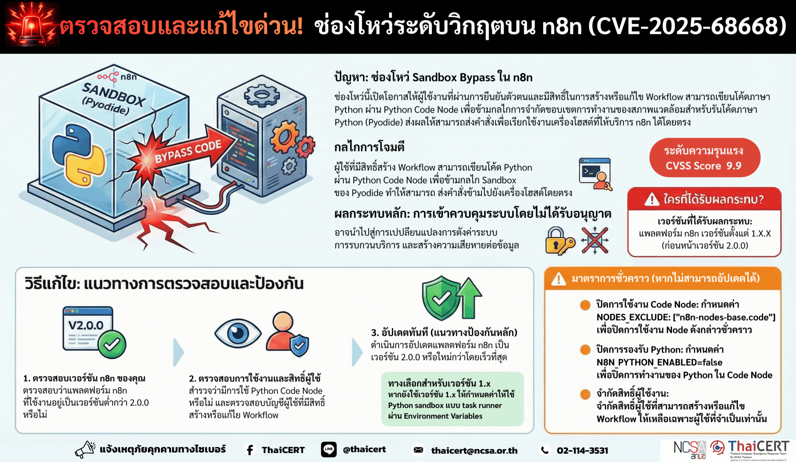 • CVE-2025-68668 เป็นช่องโหว่ที่มีระดับความรุนแรงวิกฤต คะแนน CVSS 9.9 จัดอยู่ในประเภท Sandbox Bypass หรือ เกิดจากความบกพร่องของกลไกการจำกัดขอบเขตการทำงานของโค้ด เหตุการณ์นี้เกิดขึ้นในส่วนฟังก์ชัน Python Code Node บนแพลตฟอร์ม n8n โดยฟังก์ชันดังกล่าวจะมีการเรียกใช้ Pyodide (Python runtime บน WebAssembly) เพื่อสร้างสภาพแวดล้อมสำหรับประมวลผลโค้ดภาษา Python ภายใน Workflow n8n