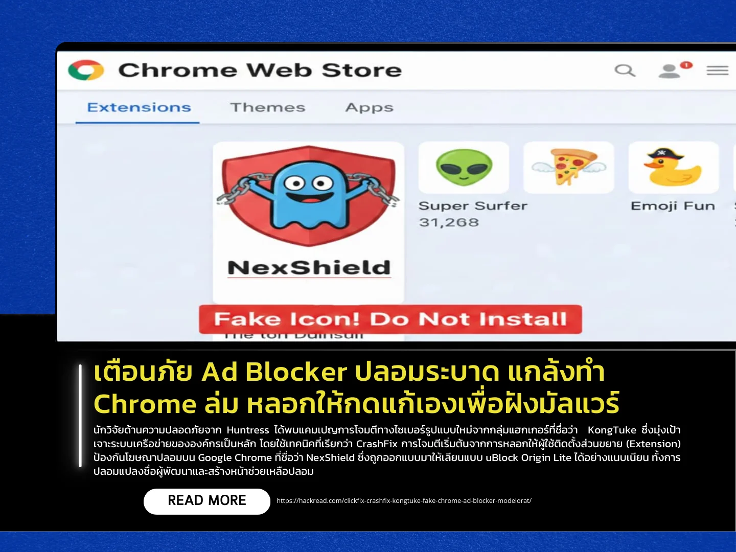 นักวิจัยด้านความปลอดภัยจาก Huntress ได้พบแคมเปญการโจมตีทางไซเบอร์รูปแบบใหม่จากกลุ่มแฮกเกอร์ที่ชื่อว่า  KongTuke ซึ่งมุ่งเป้าเจาะระบบเครือข่ายขององค์กรเป็นหลัก โดยใช้เทคนิคที่เรียกว่า CrashFix การโจมตีเริ่มต้นจากการหลอกให้ผู้ใช้ติดตั้งส่วนขยาย (Extension) ป้องกันโฆษณาปลอมบน Google Chrome ที่ชื่อว่า NexShield ซึ่งถูกออกแบบมาให้เลียนแบบ uBlock Origin Lite ได้อย่างแนบเนียน ทั้งการปลอมแปลงชื่อผู้พัฒนาและสร้างหน้าช่วยเหลือปลอม เมื่อเหยื่อหลงเชื่อติดตั้งลงในเครื่อง ส่วนขยายนี้จะรอเวลาประมาณ 60 นาที ก่อนจะรันสคริปต์เพื่อส่งคำสั่งเชื่อมต่อจำนวนมาก (ยิง DoS) ใส่เครื่องคอมพิวเตอร์ของเหยื่อ จนทรัพยากรเครื่องถูกใช้จนหมด ส่งผลให้เบราว์เซอร์ค้างและล่มไปในที่สุด