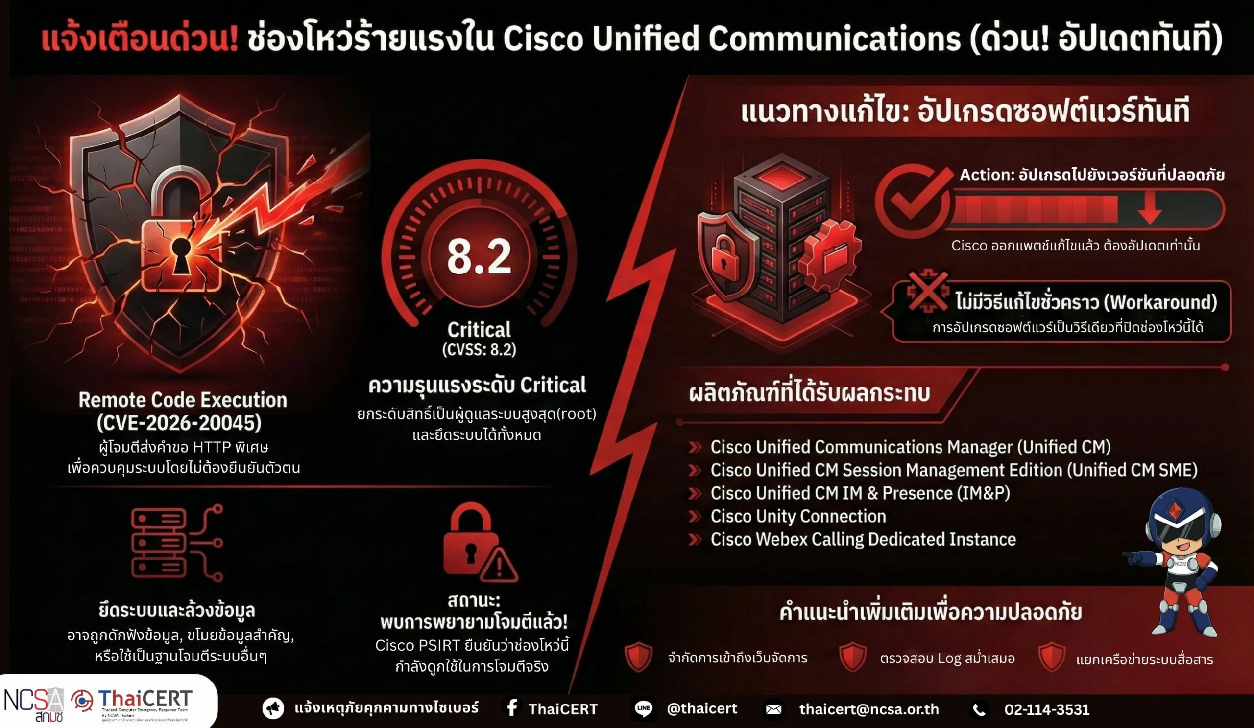 ThaiCERT ได้ติดตามสถานการณ์ภัยคุกคามทางไซเบอร์ และพบประกาศด้านความปลอดภัยจาก Cisco เกี่ยวกับช่องโหว่ระดับ Critical ในผลิตภัณฑ์ Cisco Unified Communications ซึ่งหากไม่ดำเนินการแก้ไข อาจทำให้ผู้ไม่หวังดีสามารถรันคำสั่งบนระบบจากระยะไกล และยกระดับสิทธิ์เป็นผู้ดูแลระบบ (root) ได้ ส่งผลกระทบร้ายแรงต่อความมั่นคงปลอดภัยของระบบสารสนเทศของหน่วยงาน