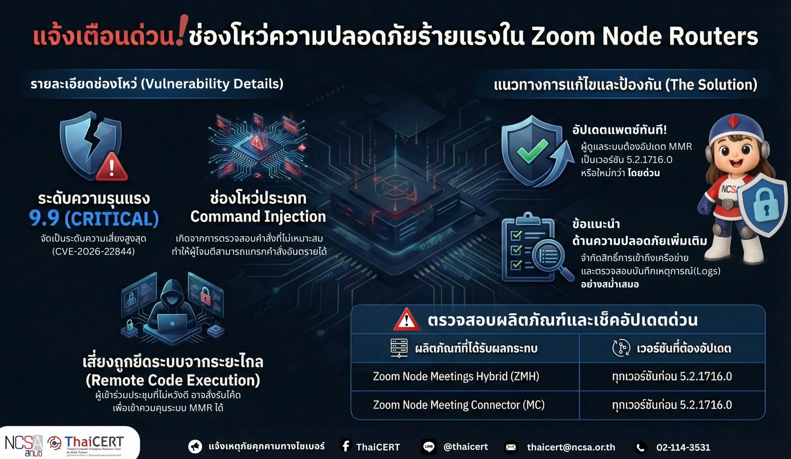 Zoom ได้ออกอัปเดตความปลอดภัยเพื่อแก้ไขช่องโหว่ (CVE-2026-22844) มีคะแนน CVSS: 9.9 เป็นช่องโหว่ประเภท Command Injection ที่ส่งผลกระทบต่อ Zoom Node Multimedia Routers (MMRs) ซึ่งอาจเปิดโอกาสให้ผู้เข้าร่วมการประชุมสามารถดำเนินการโจมตีเพื่อรันโค้ดจากระยะไกล (Remote Code Execution) บนระบบ MMR ได้ผ่านการเข้าถึงเครือข่าย