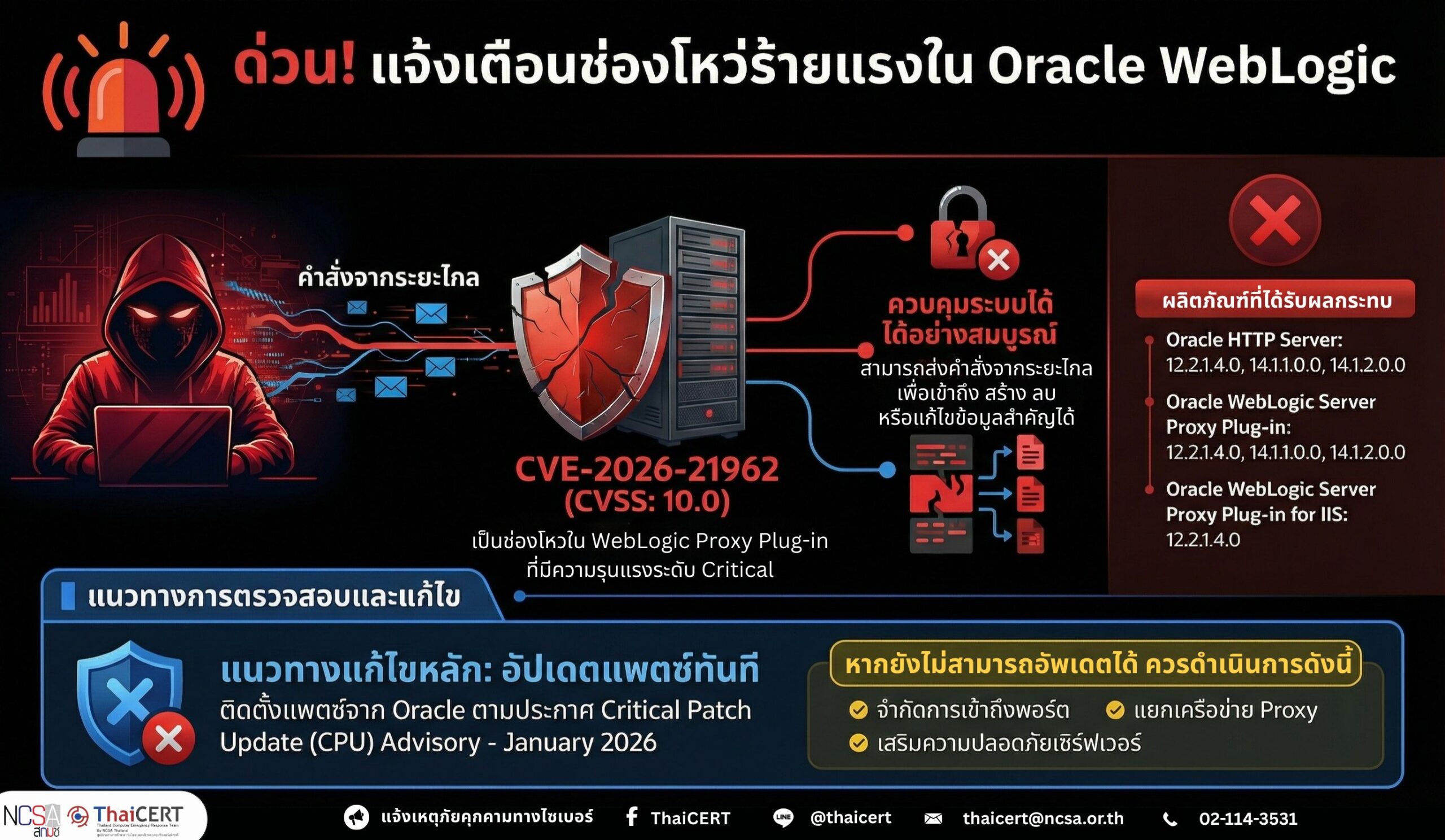 ช่องโหว่ CVE-2026-21962 ใน WebLogic Proxy Plug-in มีคะแนน CVSS:v3.1: 10.0 ซึ่งสามารถทำให้ผู้ไม่หวังดีใช้คำสั่งจากระยะไกลและเข้าควบคุมระบบได้อย่างสมบูรณ์ ผู้ไม่หวังดีสามารถส่งคำขอที่ออกแบบเป็นพิเศษไปยังส่วน Proxy เพื่อเข้าควบคุม Oracle HTTP Server หรือ WebLogic Server Proxy Plug‑in ทำให้สามารถเข้าถึงข้อมูลสำคัญ รวมถึงการ สร้าง ลบ หรือแก้ไขที่อยู่ในระบบได้