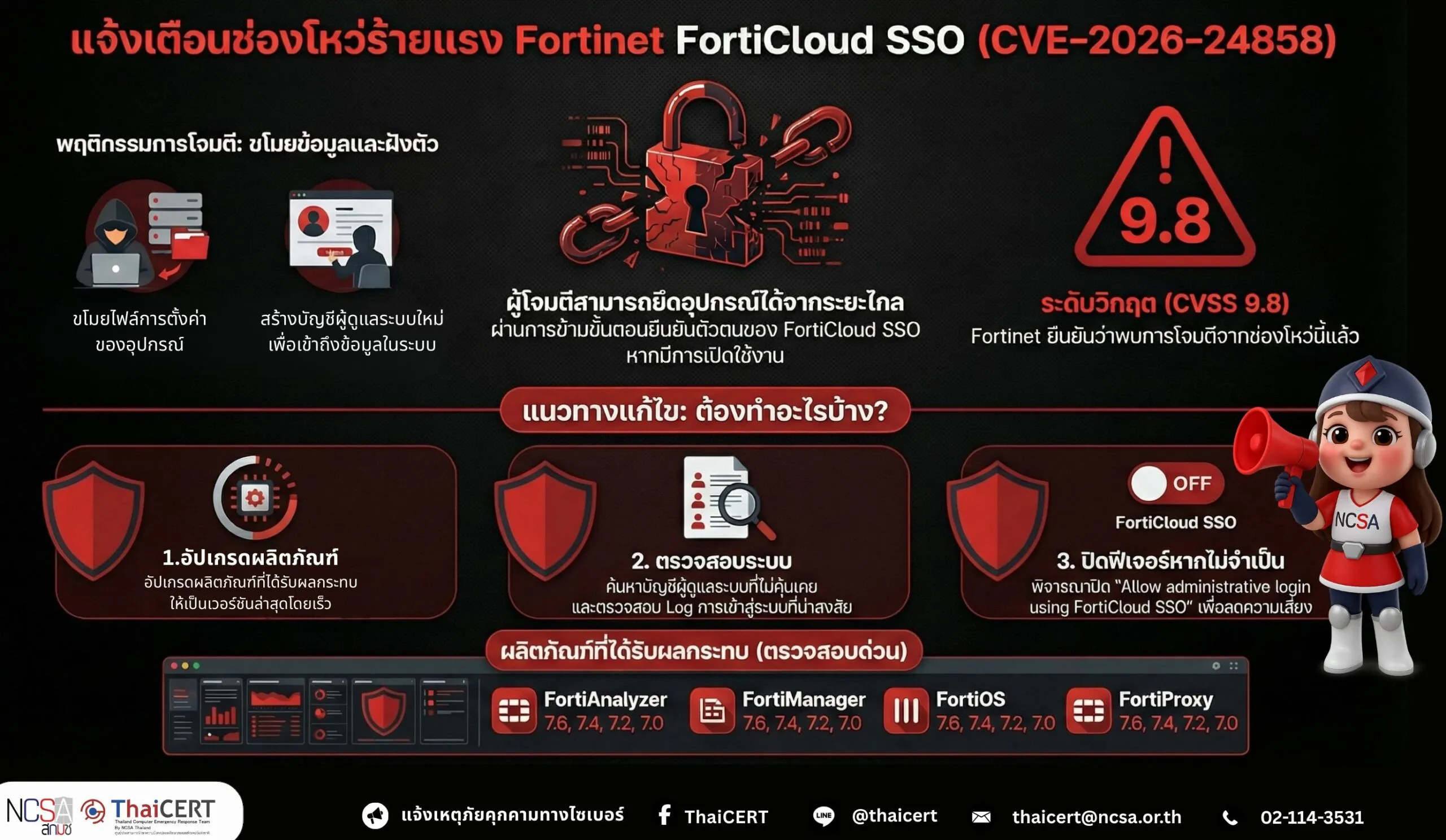 ศูนย์ประสานการรักษาความมั่นคงปลอดภัยระบบคอมพิวเตอร์แห่งชาติ (ThaiCERT) ได้ติดตามสถานการณ์ภัยคุกคามทางไซเบอร์ และพบประกาศแจ้งเตือนด้านความปลอดภัยจาก Fortinet เกี่ยวกับช่องโหว่การข้ามการยืนยันตัวตน (Authentication Bypass) ในการทำงานของ FortiCloud Single Sign-On (SSO) ซึ่งอาจเปิดโอกาสให้ผู้โจมตีเข้าควบคุมอุปกรณ์ของบัญชีผู้ใช้รายอื่นได้ หากมีการเปิดใช้งาน FortiCloud SSO