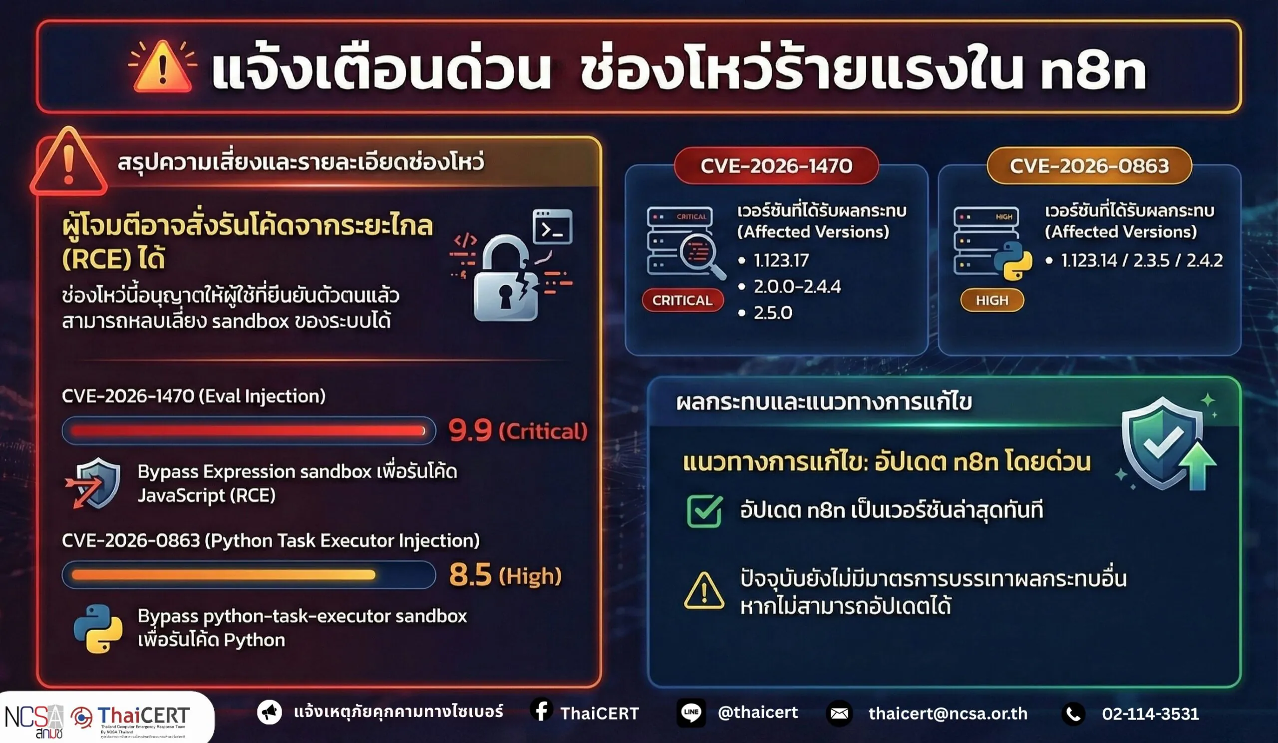 ThaiCERT ได้ติดตามสถานการณ์ภัยคุกคามทางไซเบอร์ และพบประกาศด้านความมั่นคงปลอดภัยของผู้เชี่ยวชาญด้านความปลอดภัยไซเบอร์จาก JFrog Security Research ได้เปิดเผยช่องโหว่ 2 รายการ ในแพลตฟอร์ม workflow automation ของ n8n ซึ่งสามารถเปิดทางให้ผู้โจมตีที่ผ่านการยืนยันตัวตนแล้ว (authenticated user) ทำการ รันโค้ดจากระยะไกล (Remote Code Execution – RCE) ได้