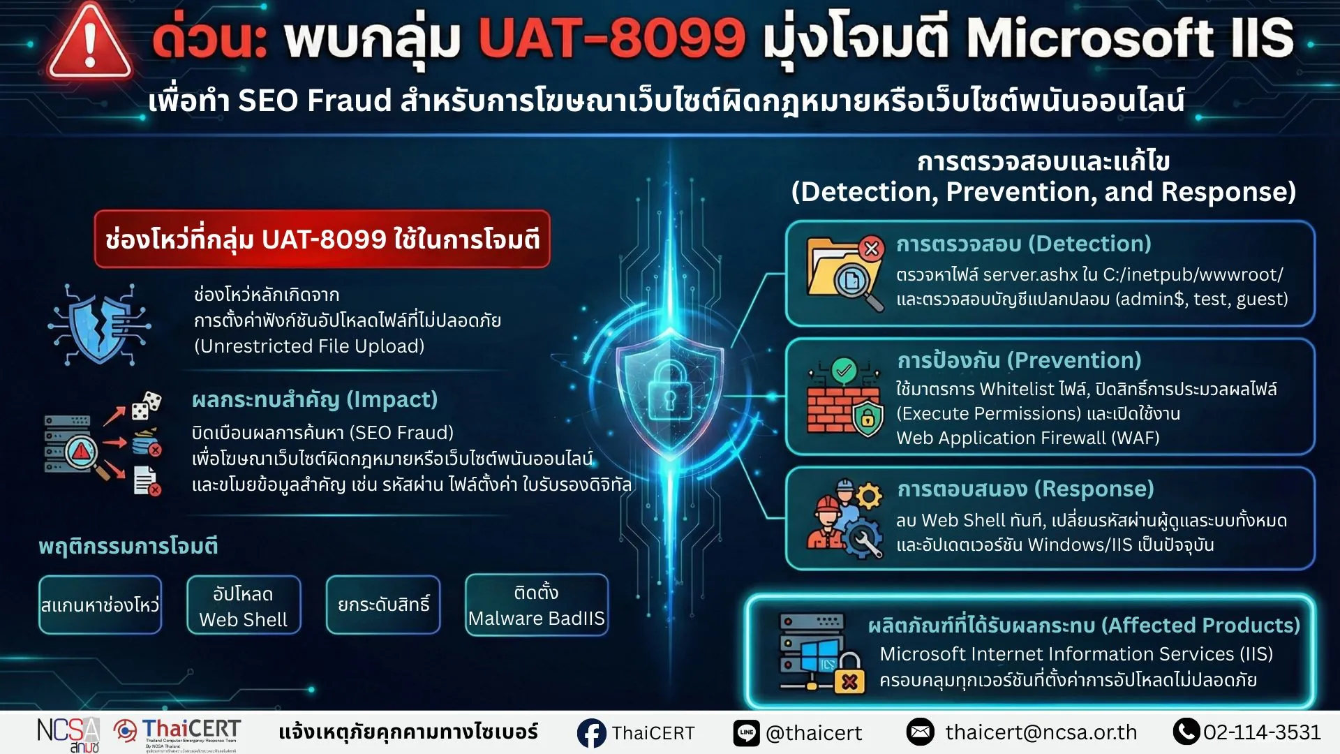 ThaiCERT ติดตามสถานการณ์และพบรายงานจาก Cisco Talos ระบุว่ากลุ่ม UAT-8099 โจมตีเซิร์ฟเวอร์ที่ใช้งาน Microsoft Internet Information Services (IIS) โดยอาศัย การกำหนดค่าไม่รัดกุม (Misconfiguration) โดยเฉพาะกรณี อัปโหลดไฟล์ได้โดยไม่จำกัด (Unrestricted File Upload) เพื่อติดตั้ง Web Shell/เครื่องมือควบคุมระยะไกล ขโมยข้อมูลสำคัญ (เช่น รหัสผ่าน ไฟล์ตั้งค่า ใบรับรองดิจิทัล) และใช้ทรัพยากรขององค์กรเป็นฐานปฏิบัติการ ทั้งนี้ ประเทศไทยเป็นหนึ่งในประเทศเป้าหมายหลัก ของแคมเปญดังกล่าว