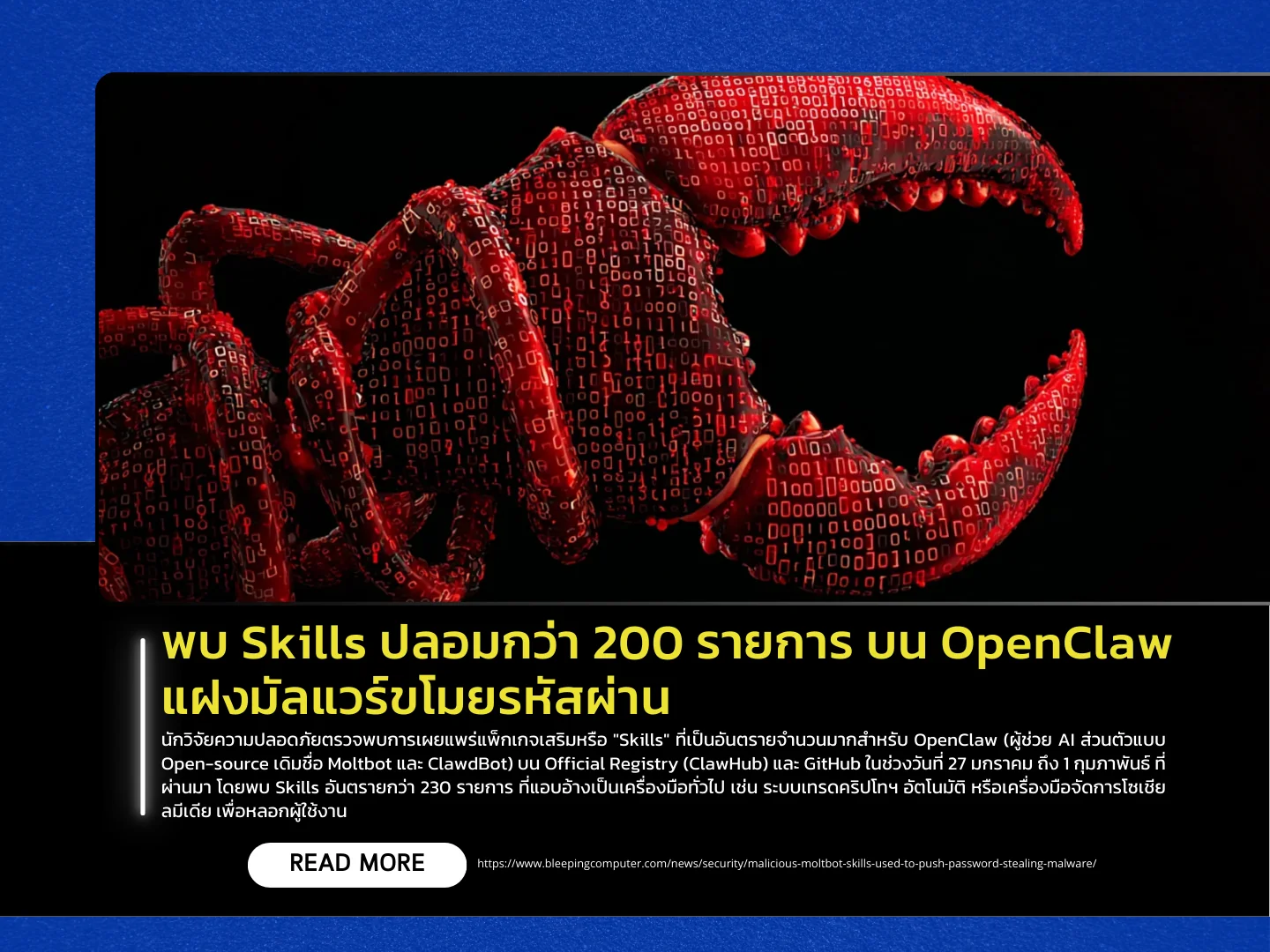 นักวิจัยความปลอดภัยตรวจพบการเผยแพร่แพ็กเกจเสริมหรือ “Skills” ที่เป็นอันตรายจำนวนมากสำหรับ OpenClaw (ผู้ช่วย AI ส่วนตัวแบบ Open-source เดิมชื่อ Moltbot และ ClawdBot) บน Official Registry (ClawHub) และ GitHub ในช่วงวันที่ 27 มกราคม ถึง 1 กุมภาพันธ์ ที่ผ่านมา โดยพบ Skills อันตรายกว่า 230 รายการ ที่แอบอ้างเป็นเครื่องมือทั่วไป เช่น ระบบเทรดคริปโทฯ อัตโนมัติ หรือเครื่องมือจัดการโซเชียลมีเดีย เพื่อหลอกผู้ใช้งาน