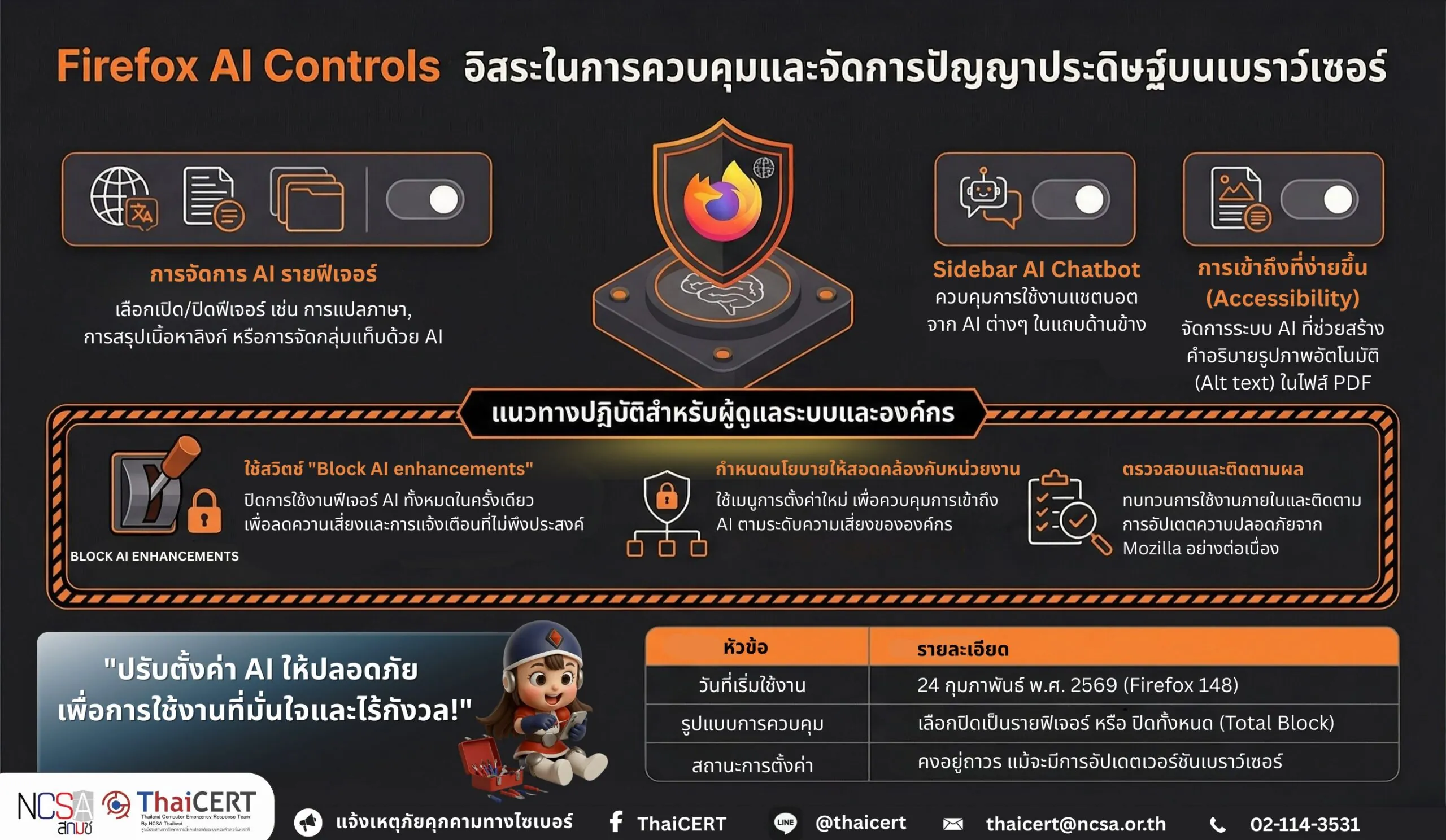 ศูนย์ประสานการรักษาความมั่นคงปลอดภัยระบบคอมพิวเตอร์แห่งชาติ (ThaiCERT) ได้ติดตามสถานการณ์ข้อมูลข่าวสารเกี่ยวกับการพัฒนาและการควบคุมการใช้งานเทคโนโลยีปัญญาประดิษฐ์ กรณี Mozilla ได้เพิ่มความสามารถในการควบคุมและปิดการใช้งานฟีเจอร์ Generative AI ภายในเว็บเบราว์เซอร์ Firefox เวอร์ชันเดสก์ท็อป เพื่อให้ผู้ใช้และผู้ดูแลระบบสามารถบริหารจัดการการใช้งาน AI ได้อย่างเหมาะสมและสอดคล้องกับนโยบายด้านความมั่นคงปลอดภัยสารสนเทศ