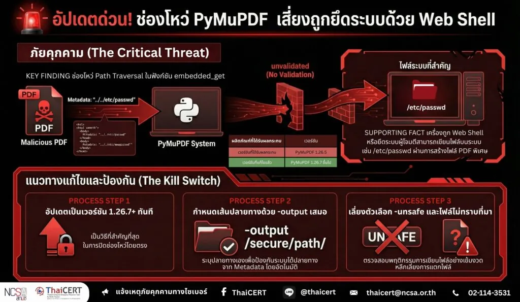 ศูนย์ประสานการรักษาความมั่นคงปลอดภัยระบบคอมพิวเตอร์แห่งชาติ (ThaiCERT) แจ้งเตือนภัยคุกคามด้านความมั่นคงปลอดภัยไซเบอร์เกี่ยวกับช่องโหว่ประเภท Path Traversal ในไลบรารี PyMuPDF (ไลบรารีสำหรับอ่าน วิเคราะห์ และจัดการเอกสาร PDF ด้วยภาษา Python) ที่อาจถูกผู้ไม่หวังดีใช้ในการเขียนไฟล์ไปยังตำแหน่งที่ไม่ได้รับอนุญาตบนระบบ (Arbitrary File Write) ผ่านไฟล์ PDF ที่ถูกสร้างขึ้นเป็นพิเศษ และอาจนำไปสู่การฝังไฟล์อันตราย เช่น Web Shell หรือการยกระดับในการเข้าควบคุมระบบได้
