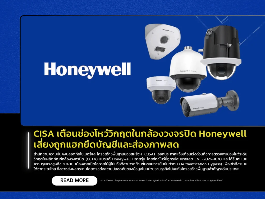 สำนักงานความมั่นคงปลอดภัยไซเบอร์และโครงสร้างพื้นฐานของสหรัฐฯ (CISA) ออกประกาศแจ้งเตือนเร่งด่วนถึงการตรวจพบช่องโหว่ระดับวิกฤตในผลิตภัณฑ์กล้องวงจรปิด (CCTV) แบรนด์ Honeywell หลายรุ่น โดยช่องโหว่นี้ถูกรหัสหมายเลข CVE-2026-1670 และได้รับคะแนนความรุนแรงสูงถึง 9.8/10 เนื่องจากเปิดโอกาสให้ผู้ไม่หวังดีสามารถข้ามขั้นตอนการยืนยันตัวตน (Authentication Bypass) เพื่อเข้าถึงระบบได้จากระยะไกล ซึ่งอาจส่งผลกระทบโดยตรงต่อความปลอดภัยของข้อมูลในหน่วยงานธุรกิจไปจนถึงโครงสร้างพื้นฐานสำคัญระดับประเทศ