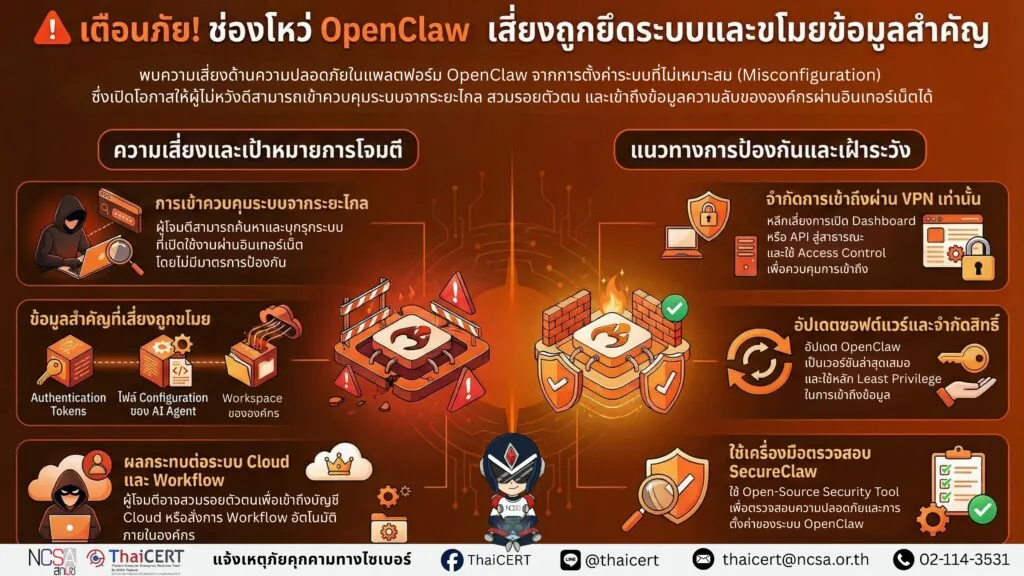 พบความเสี่ยงด้านความปลอดภัยที่เกี่ยวข้องกับแพลตฟอร์ม OpenClaw ซึ่งเป็นเครื่องมือประเภท ช่วยให้ระบบหรือผู้ใช้งานสามารถสั่งงานอัตโนมัติและเชื่อมต่อบริการต่าง ๆ ได้ โดยผู้เชี่ยวชาญด้านความปลอดภัยพบว่าการตั้งค่าระบบที่ไม่เหมาะสม (Misconfiguration) รวมถึงช่องโหว่บางส่วนของระบบ อาจเปิดโอกาสให้ผู้ไม่หวังดีเข้าถึงระบบหรือดำเนินการโจมตีได้