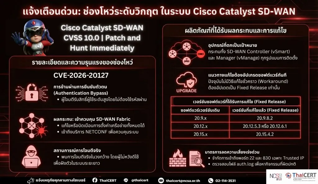 Cisco ได้เปิดเผยช่องโหว่ CVE-2026-20127 ( มีระดับความรุนแรง CVSSv3.1: 10.0 ) เป็นช่องโหว่ในกลไกการยืนยันตัวตนของการเชื่อมต่อแบบ peering ในระบบ Cisco Catalyst SD-WAN Controller (เดิม vSmart) และ Cisco Catalyst SD-WAN Manager (เดิม vManage) เกิดจากกระบวนการ peering authentication ทำงานไม่ถูกต้อง ทำให้ผู้โจมตีจากระยะไกลที่ไม่ได้ผ่านการพิสูจน์ตัวตนสามารถส่ง crafted requests เพื่อข้ามขั้นตอนการยืนยันตัวตน (Authentication Bypass) และเข้าสู่ระบบด้วยบัญชีภายในที่มีสิทธิ์ระดับสูง (non-root, high-privileged account) ได้สำเร็จ ซึ่งอาจนำไปสู่การเข้าถึงบริการ NETCONF และการแก้ไขหรือควบคุมการตั้งค่าเครือข่ายของ SD-WAN fabric