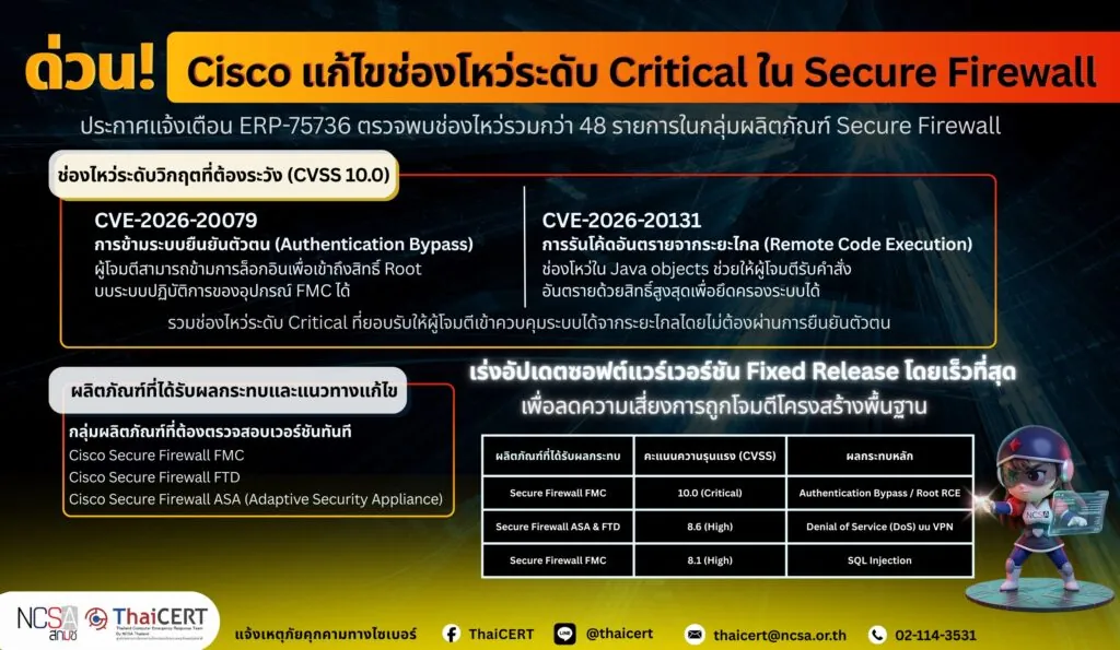 บริษัท Cisco ได้เผยแพร่ประกาศด้านความปลอดภัย (Cisco Event Response: ERP-75736) เกี่ยวกับช่องโหว่หลายรายการในผลิตภัณฑ์กลุ่ม Cisco Secure Firewall ซึ่งรวมถึง Cisco Secure Firewall Management Center (FMC), Cisco Secure Firewall ASA และ Cisco Secure Firewall Threat Defense (FTD) ประกาศดังกล่าวครอบคลุม Security Advisory มากกว่า 20 รายการ รวมช่องโหว่ประมาณ 48 รายการ โดยมีบางช่องโหว่ที่มีระดับความรุนแรง Critical (CVSS 10.0) ซึ่งอาจทำให้ผู้โจมตีสามารถข้ามการยืนยันตัวตนหรือรันโค้ดบนอุปกรณ์ได้ ส่งผลให้สามารถควบคุมระบบ firewall หรือโครงสร้างเครือข่ายขององค์กรได้