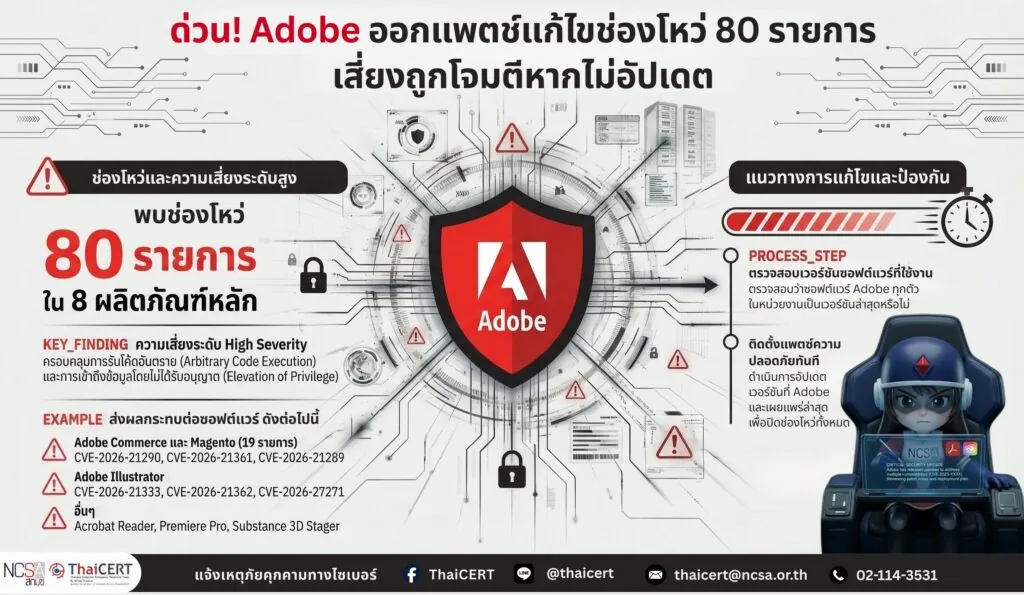 ศูนย์ประสานการรักษาความมั่นคงปลอดภัยระบบคอมพิวเตอร์แห่งชาติ (ThaiCERT) ได้ติดตามสถานการณ์ช่องโหว่ด้านความมั่นคงปลอดภัยจาก Adobe ที่ได้เผยแพร่การอัปเดตด้านความปลอดภัยเพื่อแก้ไขช่องโหว่ในผลิตภัณฑ์ รวมถึง Adobe Commerce, Magento Open Source, Adobe Illustrator, Acrobat Reader และ Premiere Pro ที่อาจส่งผลกระทบต่อความมั่นคงปลอดภัยของระบบ ผู้ดูแลระบบควรตรวจสอบระบบที่ใช้งานและดำเนินการอัปเดตแพตช์โดยเร็วเพื่อลดความเสี่ยงจากการถูกโจมตีผ่านช่องโหว่ดังกล่าว