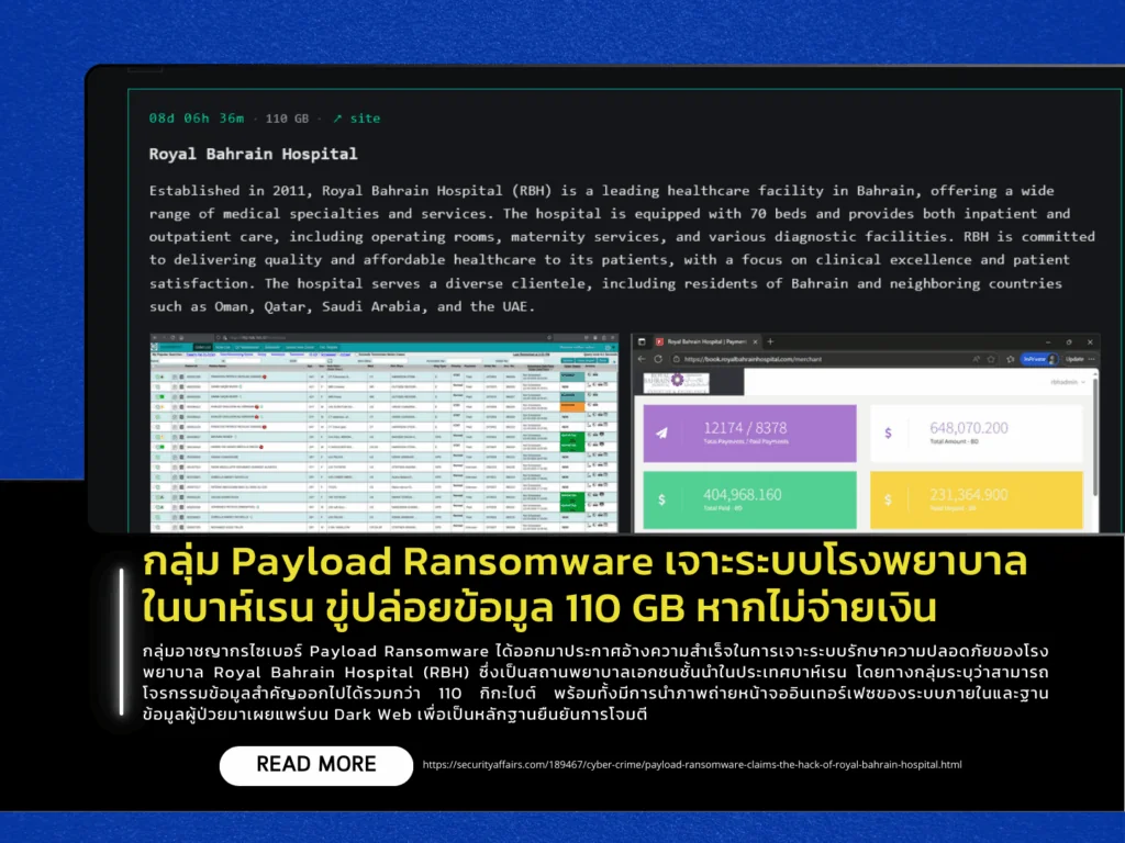กลุ่มอาชญากรไซเบอร์ Payload Ransomware ได้ออกมาประกาศอ้างความสำเร็จในการเจาะระบบรักษาความปลอดภัยของโรงพยาบาล Royal Bahrain Hospital (RBH) ซึ่งเป็นสถานพยาบาลเอกชนชั้นนำในประเทศบาห์เรน โดยทางกลุ่มระบุว่าสามารถโจรกรรมข้อมูลสำคัญออกไปได้รวมกว่า 110 กิกะไบต์ พร้อมทั้งมีการนำภาพถ่ายหน้าจออินเทอร์เฟซของระบบภายในและฐานข้อมูลผู้ป่วยมาเผยแพร่บน Dark Web เพื่อเป็นหลักฐานยืนยันการโจมตี ทั้งนี้กลุ่มแฮกเกอร์ได้ยื่นคำขาดขู่ว่าจะเปิดเผยข้อมูลที่ขโมยมาทั้งหมดสู่สาธารณะ หากทางโรงพยาบาลไม่ยอมจ่ายเงินค่าไถ่ตามที่เรียกร้องภายในวันที่ 23 มีนาคมนี้