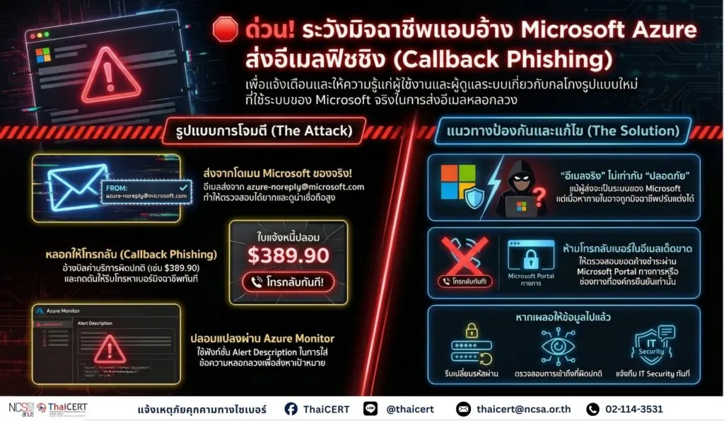 ศูนย์ประสานการรักษาความมั่นคงปลอดภัยระบบคอมพิวเตอร์แห่งชาติ (ThaiCERT) แจ้งเตือนหน่วยงานและผู้ดูแลระบบเกี่ยวกับการนำบริการ Microsoft Azure Monitor เพื่อส่งอีเมลฟิชชิงแบบ Callback Phishing โดยอีเมลดังกล่าวปลอมเป็นการแจ้งเตือนจากทีมความปลอดภัยหรือฝ่ายเรียกเก็บเงินของ Microsoft เนื้อหาอีเมลอ้างพบบิลหรือรายการเรียกเก็บเงินผิดปกติในบัญชี และเร่งให้ผู้รับติดต่อไปยังหมายเลขโทรศัพท์ที่แนบมา ขอให้ผู้ใช้งานเพิ่มความระมัดระวัง ไม่ติดต่อกลับตามหมายเลขในอีเมล ตรวจสอบข้อเท็จจริงผ่านช่องทางที่เชื่อถือได้ และหลีกเลี่ยงการเปิดเผยข้อมูลสำคัญโดยเด็ดขาด