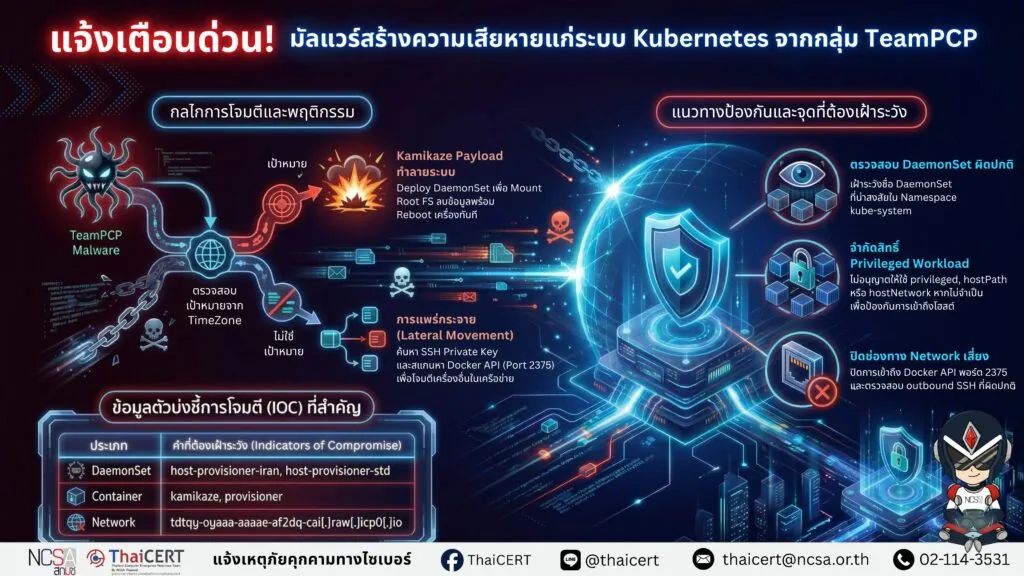 ThaiCERT ได้ติดตามสถานการณ์ภัยคุกคามทางไซเบอร์ และพบประกาศภัยคุกคามตัวใหม่ในชุดเครื่องมือของกลุ่ม TeamPCP ซึ่งครั้งนี้ไม่ใช่แค่การขโมยข้อมูลรับรองหรือฝัง backdoor แต่เป็น payload ที่สามารถลบทั้ง Kubernetes cluster ได้ โดยตัวอย่างที่พบใช้โครงสร้างควบคุมเดิมแบบ ICP canister เดียวกับแคมเปญ CanisterWorm และมีพฤติกรรมคัดแยกเป้าหมายจาก timezone และ locale ของระบบ เพื่อเลือกว่าจะ “ฝัง backdoor” หรือ “ล้างเครื่อง/ล้างคลัสเตอร์” โดยเฉพาะระบบที่เกี่ยวข้องกับประเทศเป้าหมาย [1]