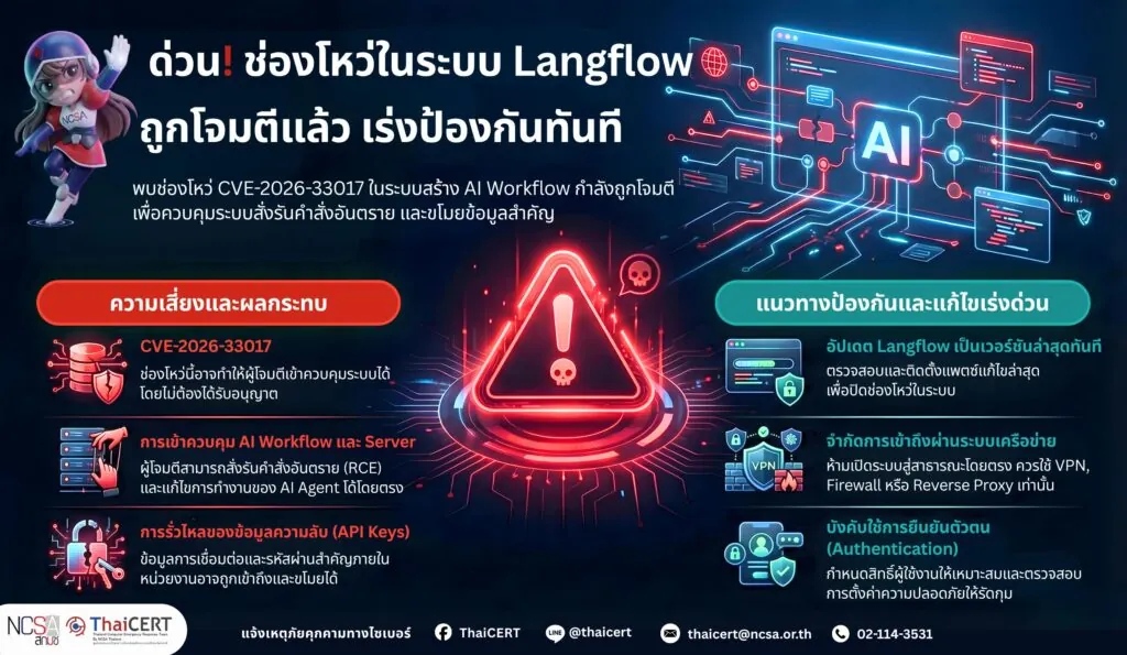 ศูนย์ประสานการรักษาความมั่นคงปลอดภัยระบบคอมพิวเตอร์แห่งชาติ (ThaiCERT) แจ้งเตือนเกี่ยวกับช่องโหว่ในระบบ Langflow ซึ่งเป็นเครื่องมือสำหรับสร้างและจัดการกระบวนการทำงานของ AI โดยพบว่าช่องโหว่นี้ถูกนำไปใช้ในการโจมตีแล้ว ผู้โจมตีอาจอาศัยช่องโหว่นี้เข้าควบคุมระบบ สั่งให้ระบบทำงานผิดปกติ หรือเข้าถึงข้อมูลสำคัญภายในระบบได้โดยไม่ได้รับอนุญาต[1]