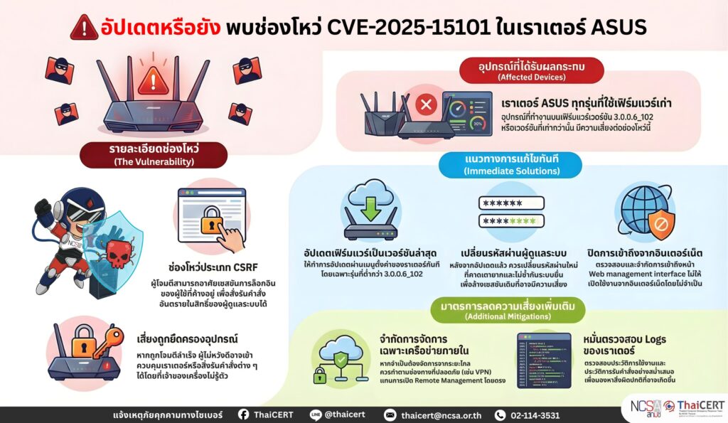 CVE-2025-15101 ( CVSS v3.1: 8.8 ) เป็นช่องโหว่ประเภท Cross-Site Request Forgery (CSRF) ช่องโหว่นี้เกิดขึ้นในหน้าเว็บบริหารจัดการของเราเตอร์ ASUS บางรุ่น ทำให้ผู้โจมตีสามารถอาศัยเซสชันของผู้ใช้เพื่อสั่งให้ระบบดำเนินการต่าง ๆ ในสิทธิ์ของผู้ใช้งาน และขยายผลไปสู่การสั่งรันคำสั่งที่ไม่ได้รับอนุญาตได้