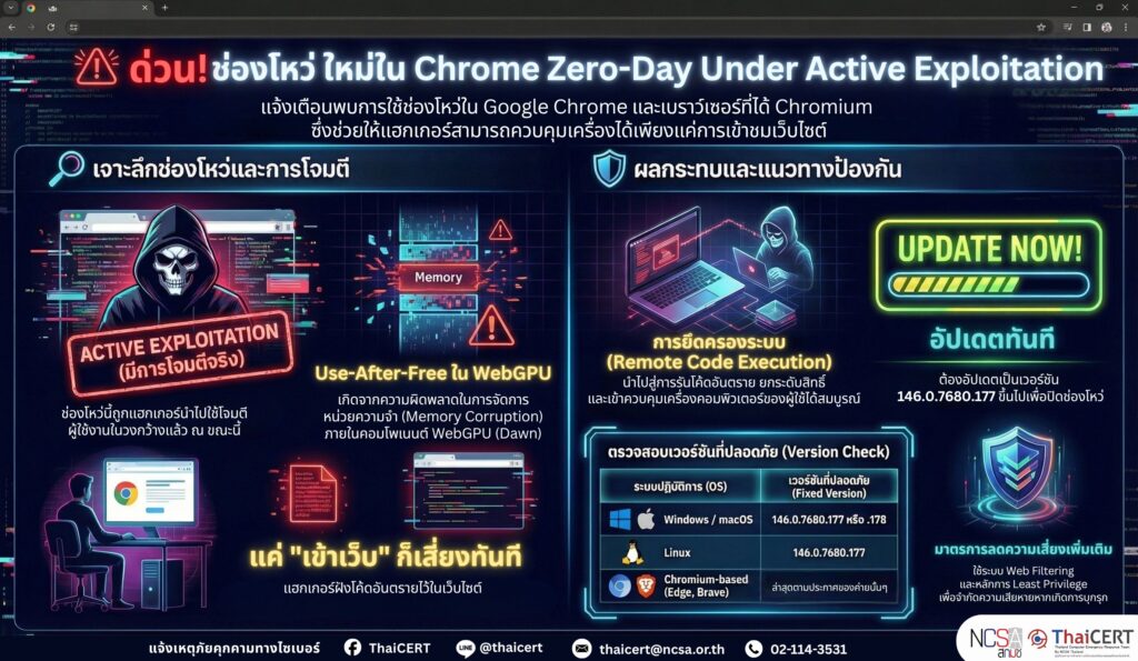 ศูนย์ประสานการรักษาความมั่นคงปลอดภัยระบบคอมพิวเตอร์แห่งชาติ (ThaiCERT) ได้ติดตามสถานการณ์ภัยคุกคามทางไซเบอร์ พบประกาศด้านความมั่นคงปลอดภัยเกี่ยวกับช่องโหว่ในเบราว์เซอร์ Google Chrome หมายเลข CVE-2026-5281 ซึ่งเป็นช่องโหว่ประเภท Use-After-Free (UAF) ในคอมโพเนนต์ WebGPU (Dawn) โดยมีรายงานว่าช่องโหว่นี้ถูกนำไปใช้ในการโจมตีแล้ว