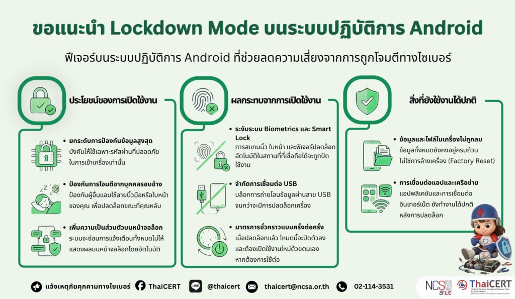 ศูนย์ประสานการรักษาความมั่นคงปลอดภัยระบบคอมพิวเตอร์แห่งชาติ (ThaiCERT) ได้ติดตามสถานการณ์ข่าวสารด้านความมั่นคงปลอดภัยไซเบอร์ที่เกี่ยวข้องกับฟีเจอร์ Lockdown Mode บนระบบปฏิบัติการ Android ซึ่งเป็นโหมดความปลอดภัยขั้นสูงที่ออกแบบมาเพื่อปกป้องอุปกรณ์ Smartphone และข้อมูลของผู้ใช้งาน เพื่อลดความเสี่ยงจากการถูกโจมตีทางไซเบอร์ ผู้ใช้งานควรดำเนินการเปิดใช้งานฟีเจอร์ดังกล่าวโดยทันที
