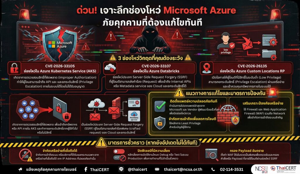 ศูนย์ประสานการรักษาความมั่นคงปลอดภัยระบบคอมพิวเตอร์แห่งชาติ (ThaiCERT) ได้ติดตามสถานการณ์ข่าวสารภัยคุกคามทางไซเบอร์ พบช่องโหว่ในผลิตภัณฑ์ Microsoft Azure จึงขอให้ผู้ดูแลระบบที่ใช้งานผลิตภัณฑ์ดังกล่าวดำเนินการตรวจสอบเวอร์ชันของระบบ และดำเนินการอัปเดตแพตช์ตามคำแนะนำของผู้พัฒนา เพื่อลดความเสี่ยงจากการถูกโจมตี