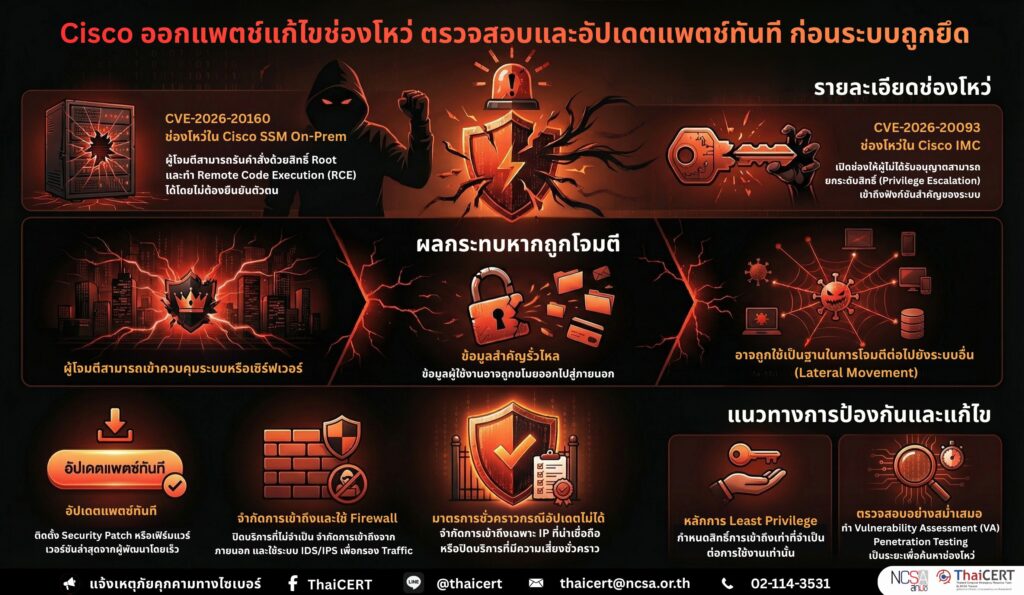 ศูนย์ประสานการรักษาความมั่นคงปลอดภัยระบบคอมพิวเตอร์แห่งชาติ (ThaiCERT) ได้ติดตามสถานการณ์ข่าวสารภัยคุกคามทางไซเบอร์ พบการประกาศอัปเดตแพตช์แก้ไขช่องโหว่ด้านความปลอดภัยในผลิตภัณฑ์ของ Cisco จึงขอให้ผู้ดูแลระบบที่ใช้งานผลิตภัณฑ์ดังกล่าวดำเนินการตรวจสอบเวอร์ชันของระบบ และดำเนินการอัปเดตแพตช์ตามคำแนะนำของผู้พัฒนา เพื่อลดความเสี่ยงจากการถูกโจมตี [1]