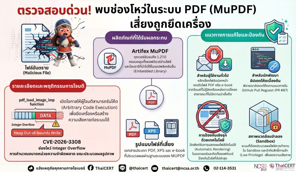 ศูนย์ประสานการรักษาความมั่นคงปลอดภัยระบบคอมพิวเตอร์แห่งชาติ (ThaiCERT) ขอแจ้งเตือนช่องโหว่ในซอฟต์แวร์ MuPDF ซึ่งเป็นโครงสร้างพื้นฐาน (Framework)