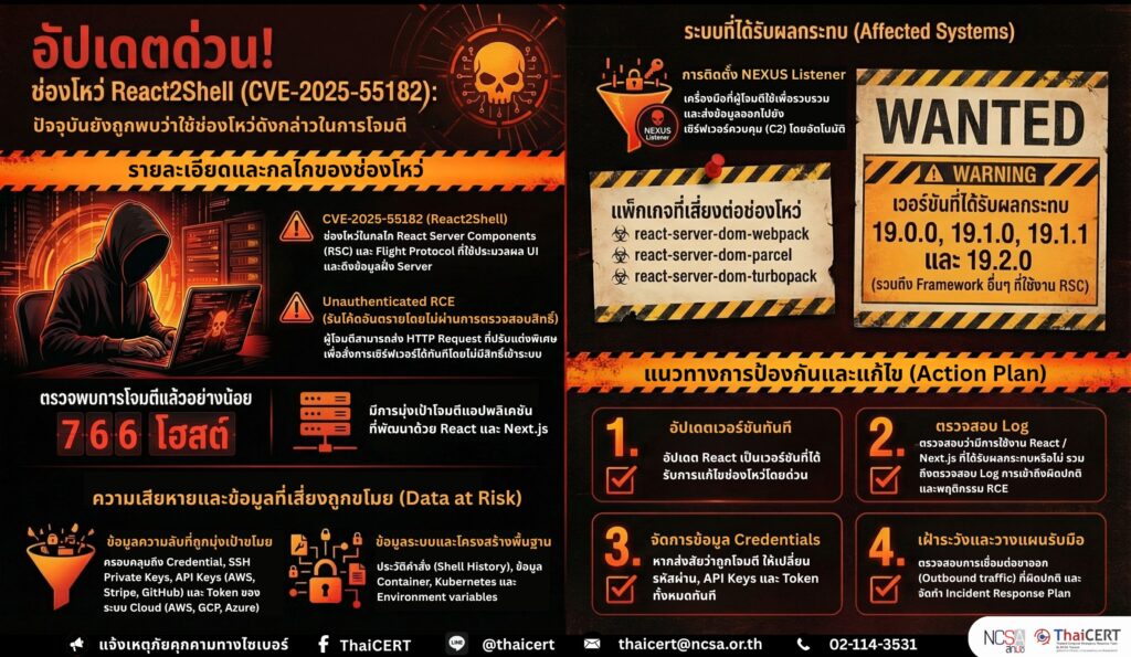 ศูนย์ประสานการรักษาความมั่นคงปลอดภัยระบบคอมพิวเตอร์แห่งชาติ (ThaiCERT) ได้ติดตามสถานการณ์ข่าวสารภัยคุกคามทางไซเบอร์ พบข่าวสารเกี่ยวกับการโจมตีที่เกิดขึ้นจริงผ่านช่องโหว่ React2Shell แนะนำผู้ดูแลระบบอัปเดตแพตช์โดยด่วน เพื่อลดความเสี่ยงจากการถูกโจมตี [1]