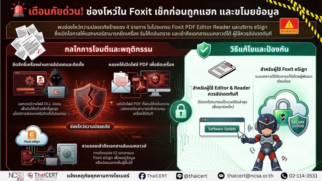 แจ้งเตือนช่องโหว่ความปลอดภัยในกลุ่มผลิตภัณฑ์ Foxit (Editor, Reader และ eSign) เสี่ยงต่อการถูกยกระดับสิทธิ์ รันโค้ดอันตราย และเข้าถึงข้อมูลโดยไม่ได้รับอนุญาต แนะผู้ใช้งานอัปเดตแพตช์ล่าสุด