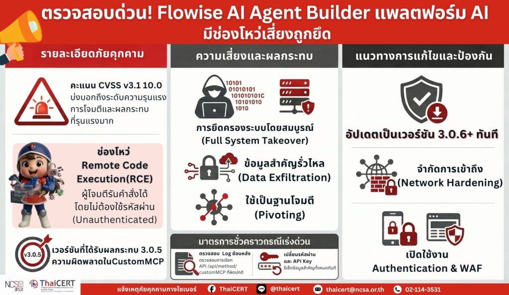 ThaiCERT ได้ติดตามสถานการณ์ภัยคุกคามทางไซเบอร์ และพบรายงานเกี่ยวกับช่องโหว่ร้ายแรงใน Flowise AI Agent Builder ซึ่งเป็นแพลตฟอร์มสำหรับสร้าง AI workflow และ chatbot สำหรับพัฒนา AI assistant และเชื่อมต่อข้อมูลเพื่อใช้งานในองค์กร ที่ช่องโหว่ CVE-2025-59528 มีความรุนแรงระดับ Critical ( CVSS v3.1 : 10.0 ) และกำลังถูกนำไปใช้โจมตี โดยช่องโหว่ดังกล่าวทำให้ผู้โจมตีสามารถเข้าควบคุมการทำงานได้โดยไม่ต้องผ่านการยืนยันตัวตน ส่งผลให้สามารถเข้าถึงข้อมูล สร้าง agent ปลอม หรือรันคำสั่งบนเซิร์ฟเวอร์ได้ทันที[1]