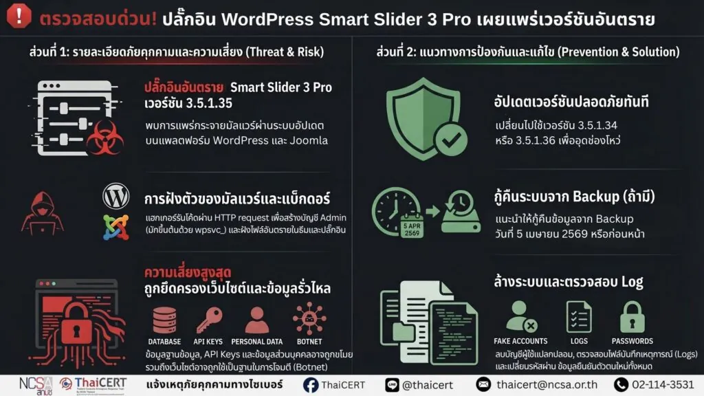 ศูนย์ประสานการรักษาความมั่นคงปลอดภัยระบบคอมพิวเตอร์แห่งชาติ (ThaiCERT) ได้ติดตามสถานการณ์ภัยคุกคามทางไซเบอร์ พบรายงานการโจมตีในลักษณะ Supply Chain Attack ต่อระบบอัปเดตของปลั๊กอิน Smart Slider 3 Pro ซึ่งเป็นเครื่องมือในการสร้าง Slider บน WordPress และ Joomla โดยกลุ่มแฮกเกอร์ได้เข้าควบคุมโครงสร้างพื้นฐานของผู้พัฒนา เพื่อแพร่กระจายปลั๊กอินเวอร์ชันที่มีการฝังมัลแวร์ [1]