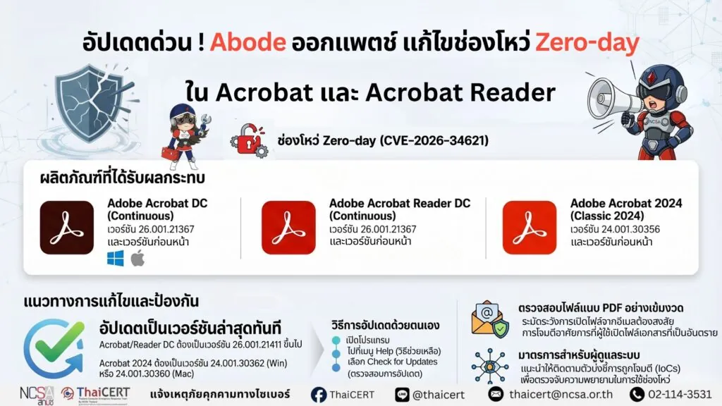 ศูนย์ประสานการรักษาความมั่นคงปลอดภัยระบบคอมพิวเตอร์แห่งชาติ (ThaiCERT) ได้ติดตามสถานการณ์ช่องโหว่ด้านความมั่นคงปลอดภัยพบว่า Adobe ได้เผยแพร่อัปเดตความปลอดภัยเพื่อแก้ไขช่องโหว่ Zero-day ใน Adobe Acrobat และ Adobe Acrobat Reader สำหรับ Windows และ macOS ซึ่ง Adobe ยืนยันพบการนำไปใช้โจมตีจริง และการโจมตีอาจนำไปสู่การรันโค้ดอันตรายได้[1]