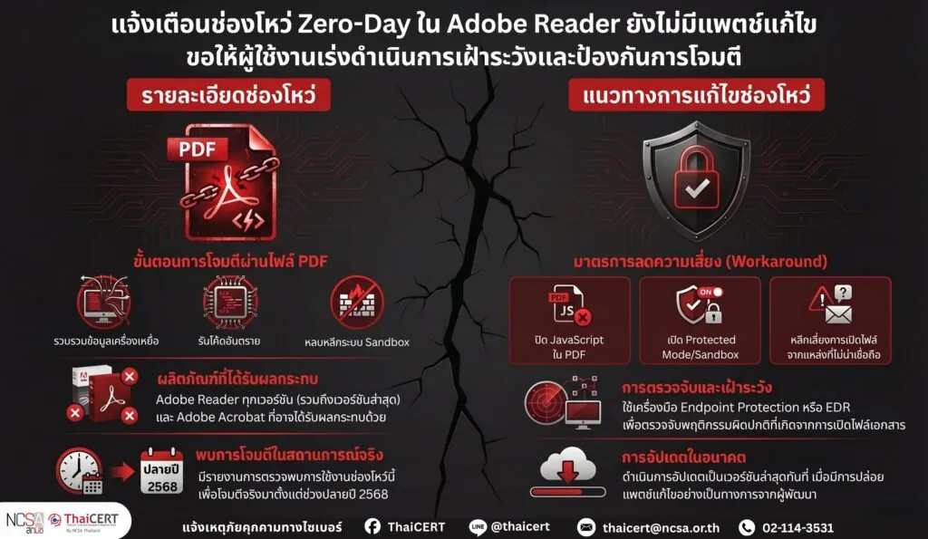 ศูนย์ประสานการรักษาความมั่นคงปลอดภัยระบบคอมพิวเตอร์แห่งชาติ (ThaiCERT) ได้ติดตามสถานการณ์ช่องโหว่ด้านความมั่นคงปลอดภัย ซึ่งพบการโจมตีช่องโหว่แบบ Zero-Day ในซอฟต์แวร์ Adobe Reader โดยผู้โจมตีใช้ไฟล์ PDF ที่ถูกออกแบบเป็นพิเศษเพื่อเริ่มต้นการโจมตี และมีแนวโน้มพัฒนาไปสู่การควบคุมระบบของผู้ใช้งาน