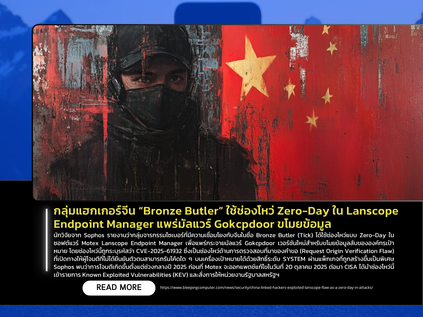 Researchers from Sophos have reported that the China-linked cyber-espionage group Bronze Butler (also known as Tick) exploited a zero-day vulnerability in Motex Lanscope Endpoint Manager to distribute a new version of the Gokcpdoor malware designed to steal sensitive corporate information. The flaw, tracked as CVE-2025-61932, is a Request Origin Verification vulnerability that allows unauthenticated attackers to execute arbitrary code with SYSTEM privileges on target machines through a specially crafted package.