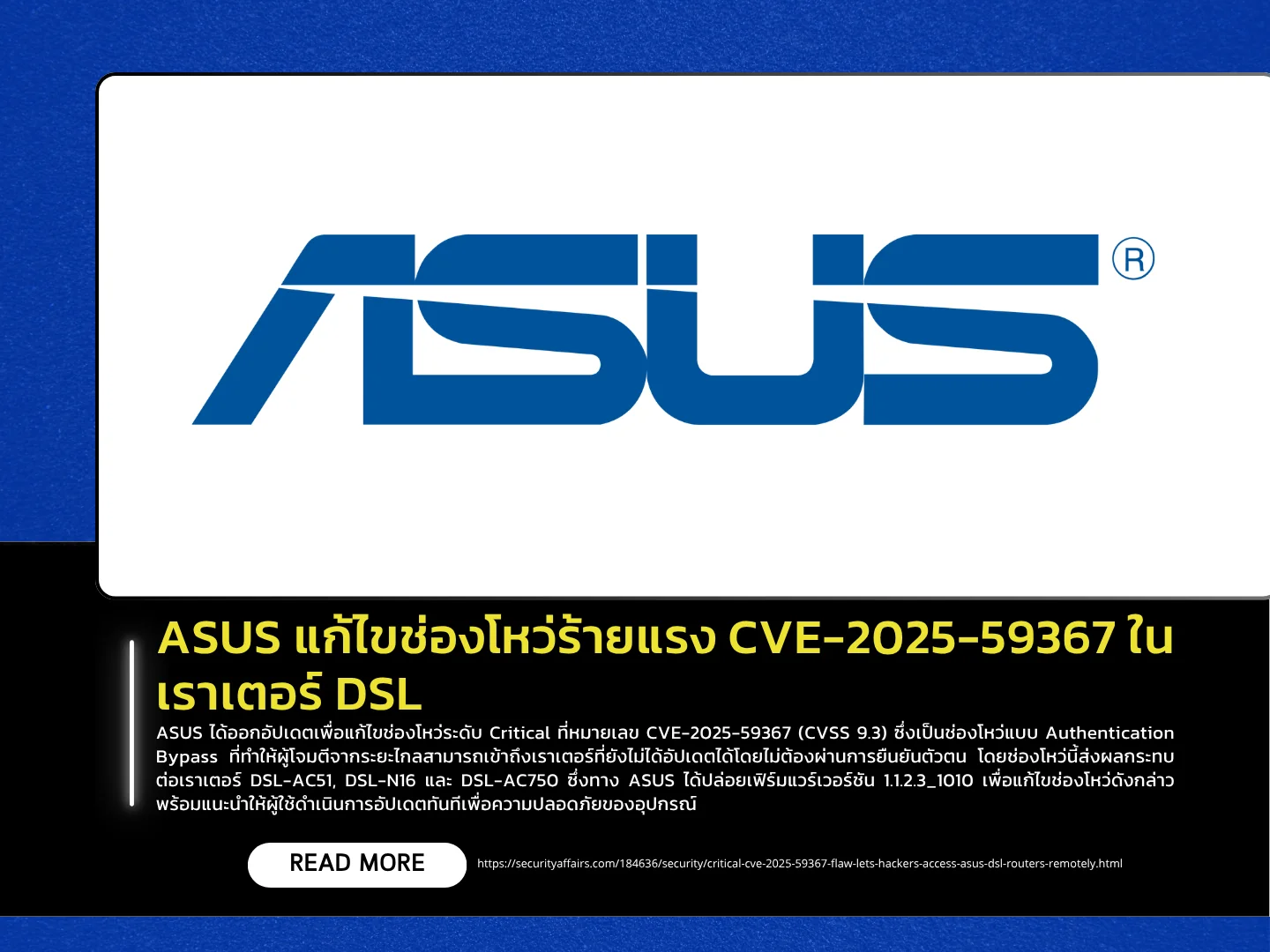 ASUS has released an update to fix a critical vulnerability identified as CVE-2025-59367 (CVSS 9.3), an authentication bypass flaw that allows remote attackers to access unpatched routers without authentication. The vulnerability affects the following DSL router models: DSL-AC51, DSL-N16, and DSL-AC750. ASUS has issued firmware version 1.1.2.3_1010 to address the issue and strongly recommends users update their devices immediately to ensure security.
