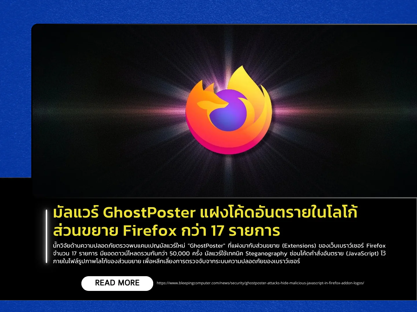 Cybersecurity researchers have uncovered a new malware campaign dubbed “GhostPoster”, which was distributed through 17 Firefox browser extensions with a combined total of more than 50,000 downloads. The malware uses steganography to conceal malicious JavaScript code inside the image files used as extension logos, allowing it to evade browser security detection mechanisms.