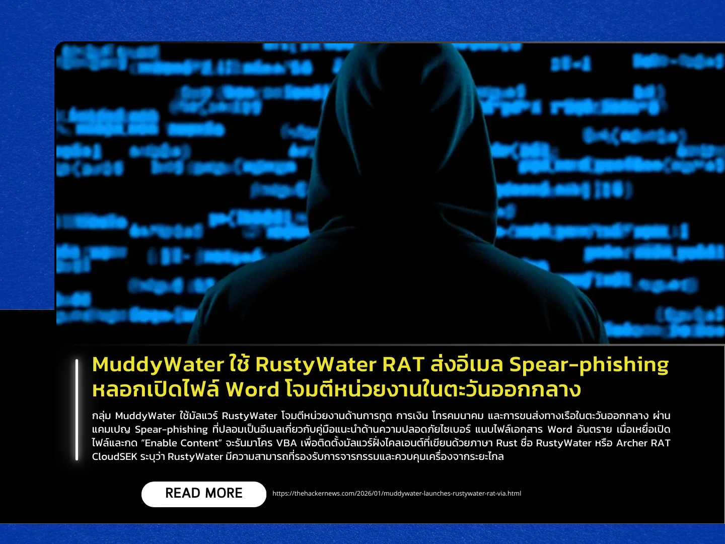 The threat group MuddyWater has launched attacks against diplomatic, financial, telecommunications, and maritime transportation organizations in the Middle East using the RustyWater malware. The campaign relies on spear-phishing emails disguised as cybersecurity safety guidance, with a malicious Microsoft Word document attached. When victims open the document and click “Enable Content,” a VBA macro is executed to install a Rust-based client-side malware known as RustyWater, also referred to as Archer RAT.