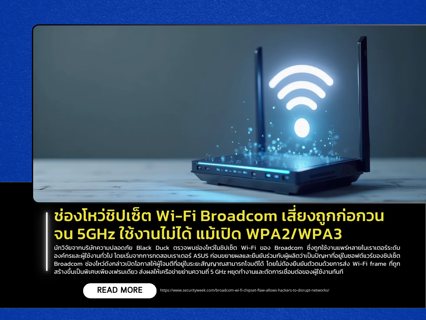 Researchers from cybersecurity firm Black Duck have identified a vulnerability in Broadcom Wi-Fi chipsets, which are widely used in both enterprise-grade and consumer routers. The issue was initially discovered during testing of ASUS routers and was later confirmed in coordination with manufacturers to stem from software flaws within the Broadcom chipset itself. The vulnerability allows an attacker within wireless range to launch an attack without authentication by sending a single specially crafted Wi-Fi frame, causing the 5 GHz network to stop functioning and immediately disconnect all connected clients.