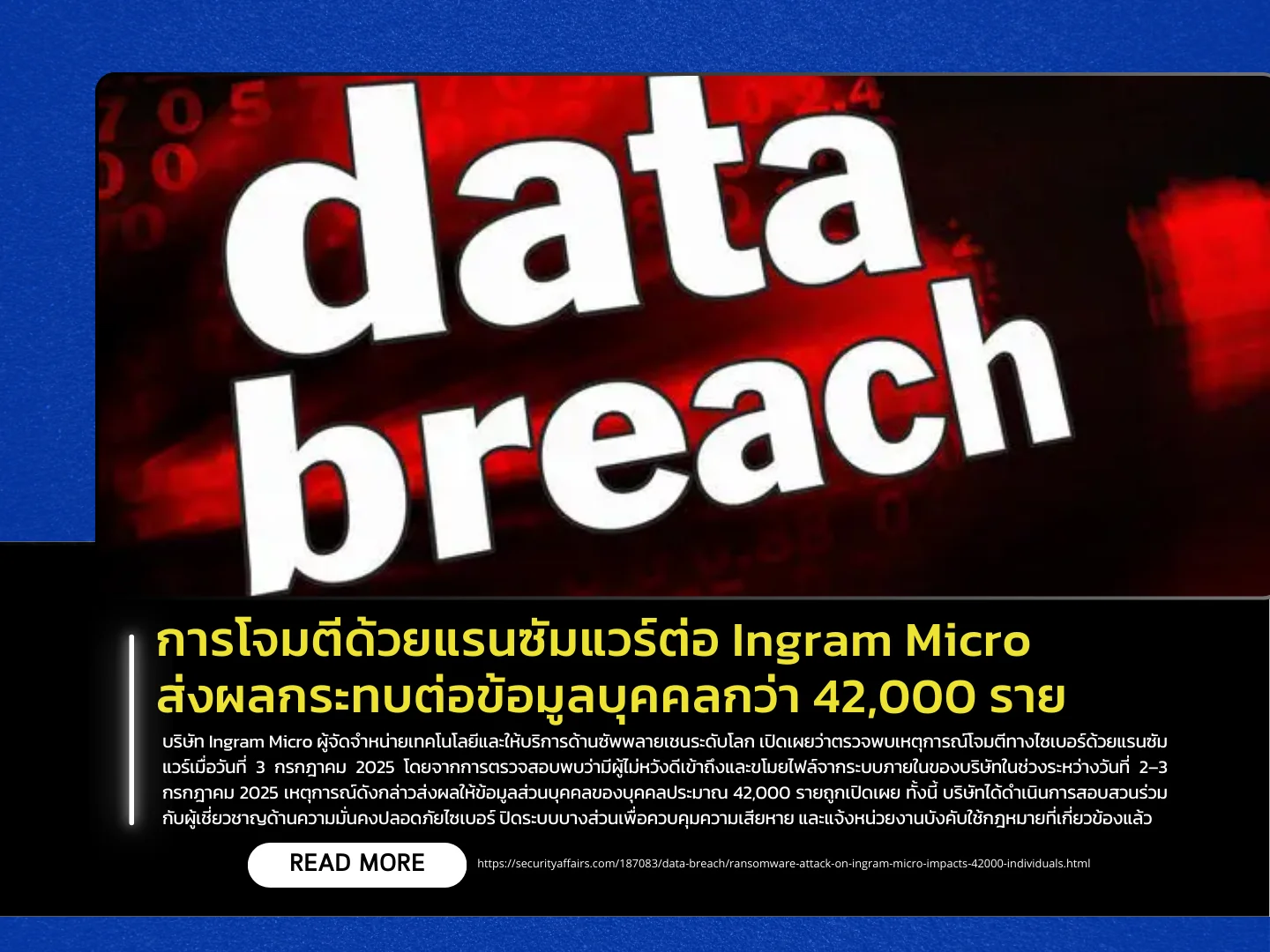 Ingram Micro, a global technology distributor and supply chain services provider, disclosed that it detected a ransomware-related cyberattack on July 3, 2025. The investigation revealed that unauthorized actors accessed and exfiltrated files from the company’s internal systems between July 2 and July 3, 2025. As a result of the incident, the personal data of approximately 42,000 individuals was exposed. The company stated that it worked with external cybersecurity experts, temporarily shut down certain systems to contain the damage, and notified relevant law enforcement authorities.